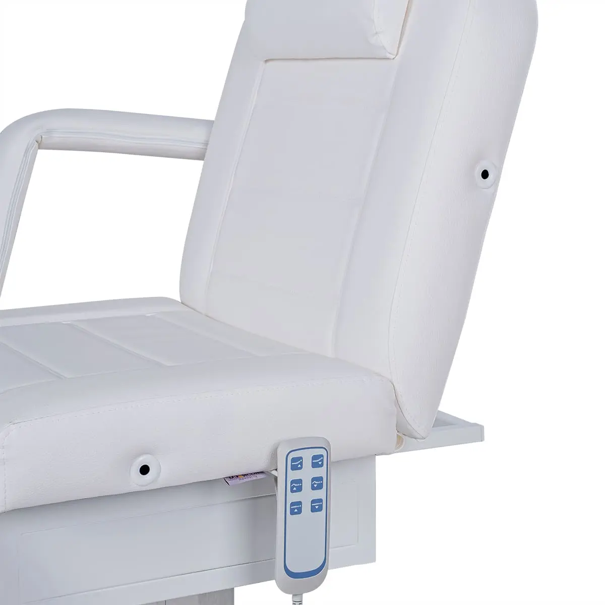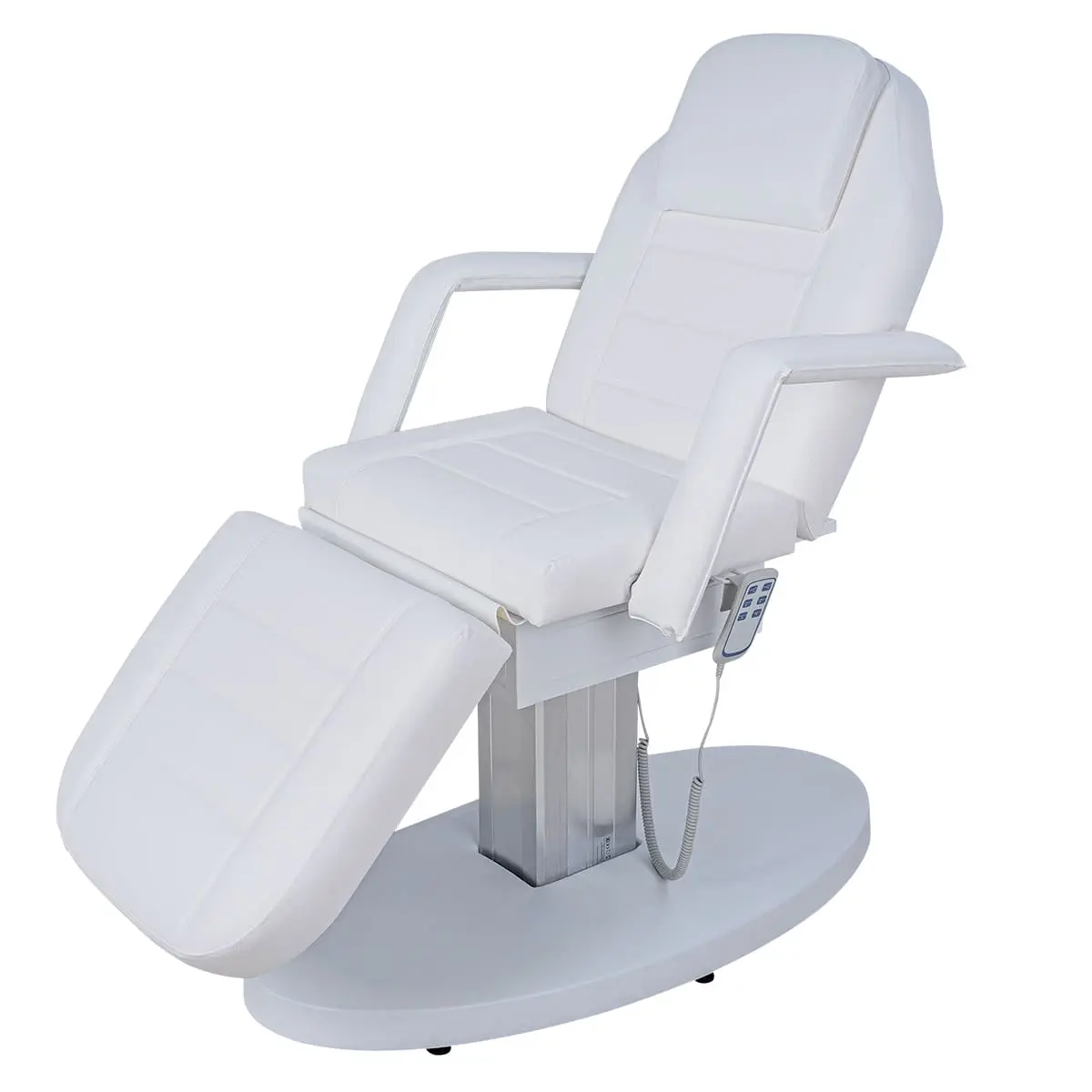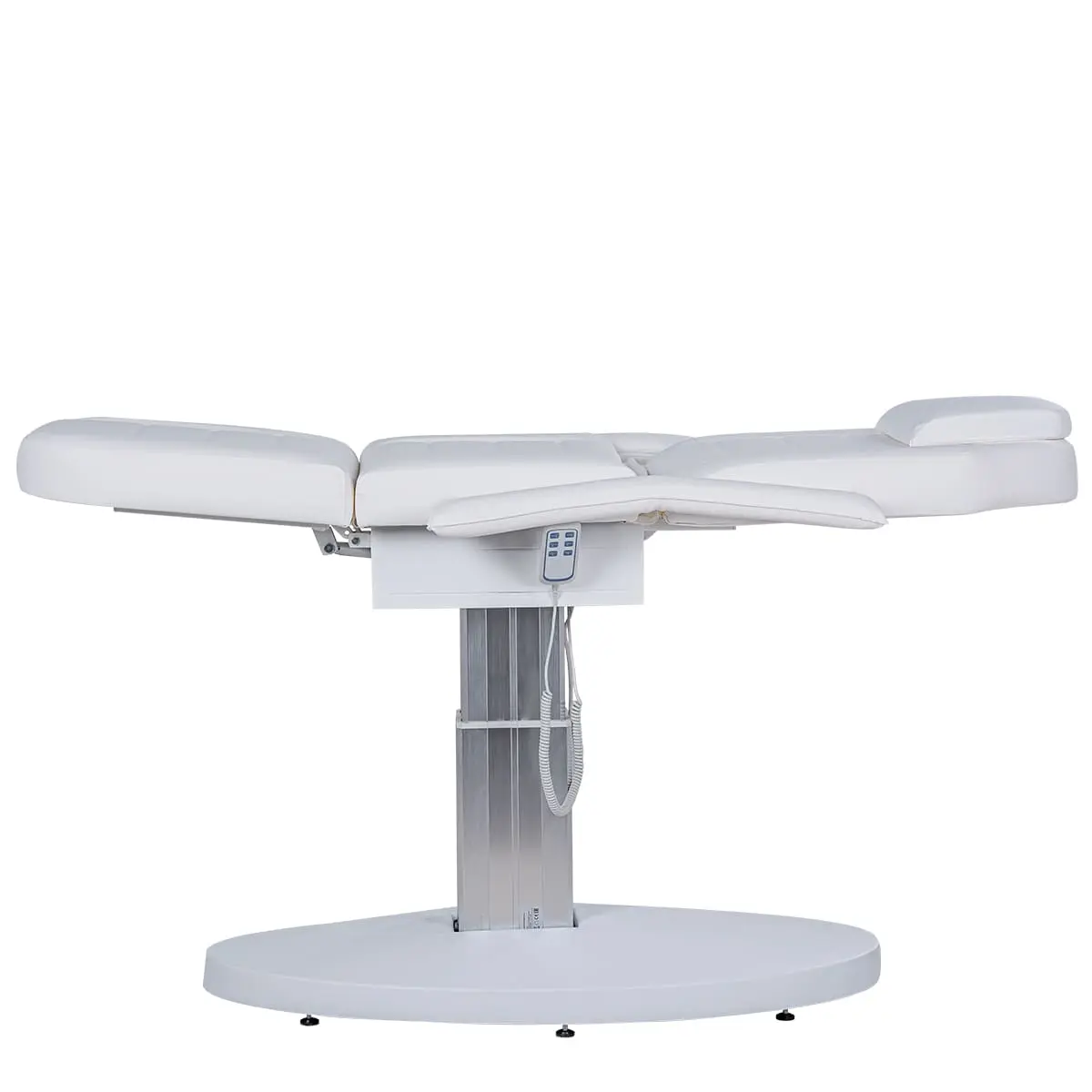 Кресло косметологическое Элегия-03 на колонне (Элегия-2) комплектуется тремя моторами электропривода, которые позволяют быстро и с комфортом для клиента менять положение мягких элементов. Пользуясь регулировками, мастер может трансформировать кресло в горизонтальное положение и использовать его в качестве косметологической или массажной кушетки. Все механические детали аккуратно спрятаны в стильной серебристой колонне. Подлокотники и подушка снимаются. Управление электроприводом осуществляется при помощи удобного пульта, который крепится к каркасу.