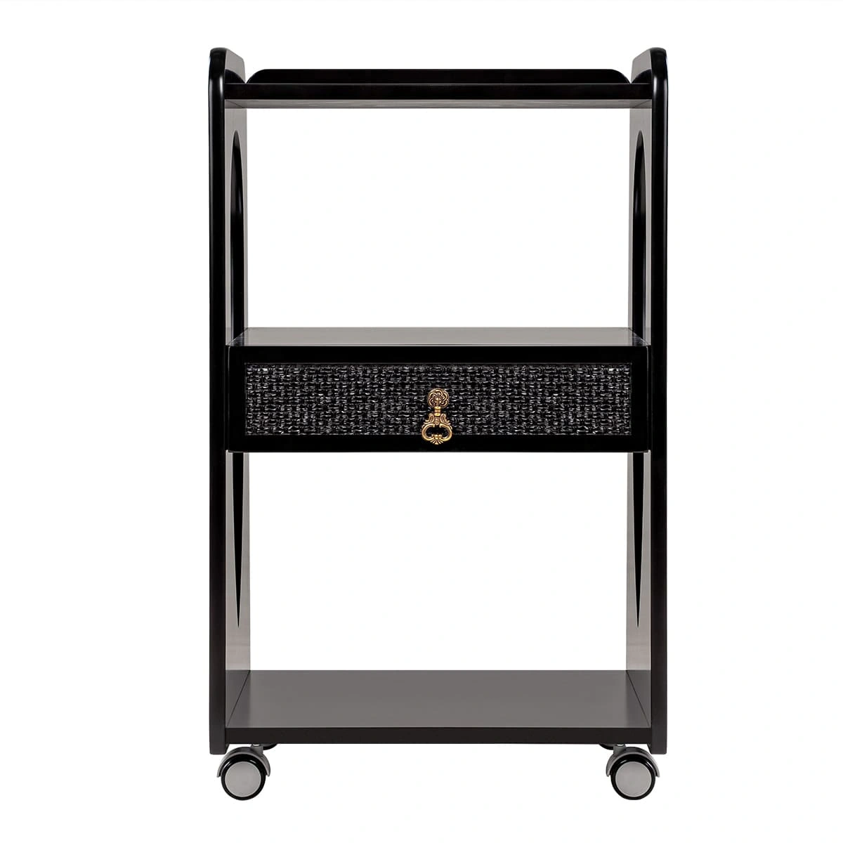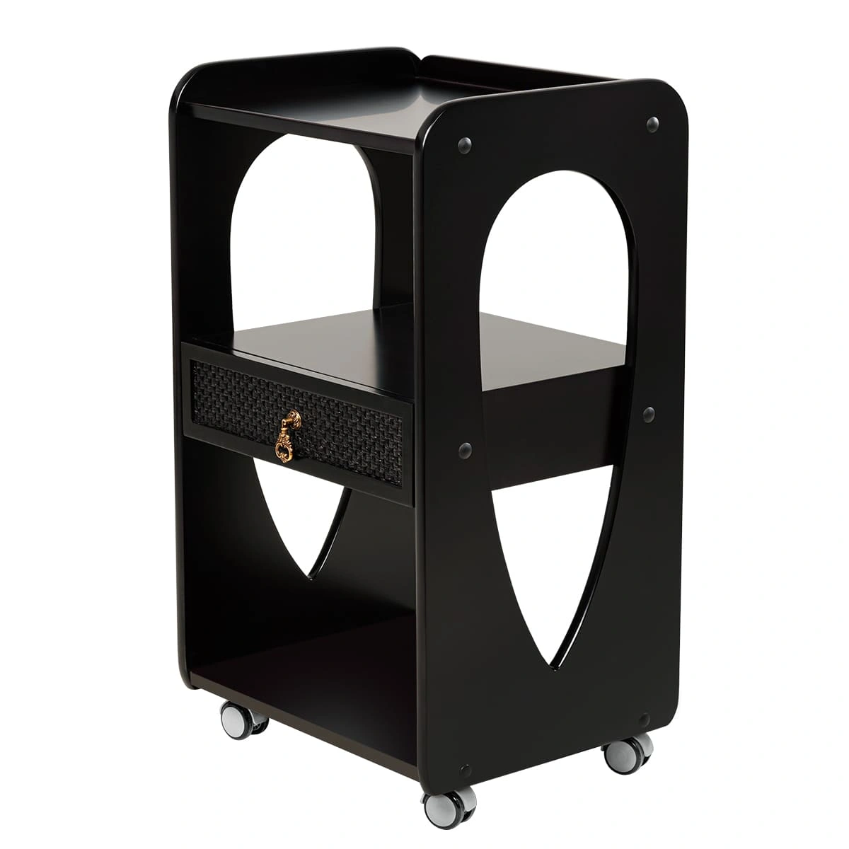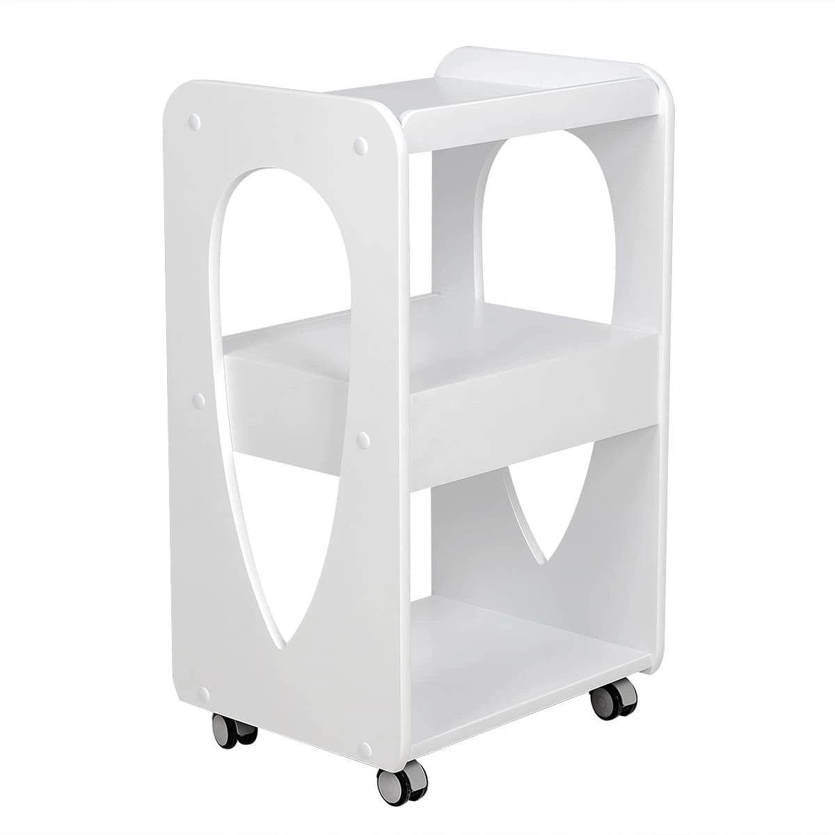 Комплектация: 1 выдвижной ящик с декорированной накладкой и 3 открытые полки; верхняя полка с бортиками; материал – дерево; 2 цвета; 4 опорных колеса, двойные, съемные.