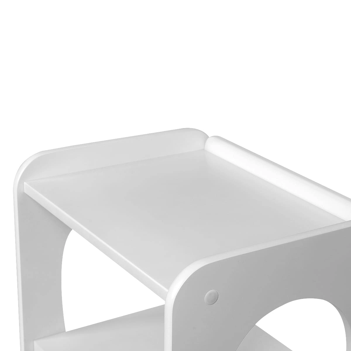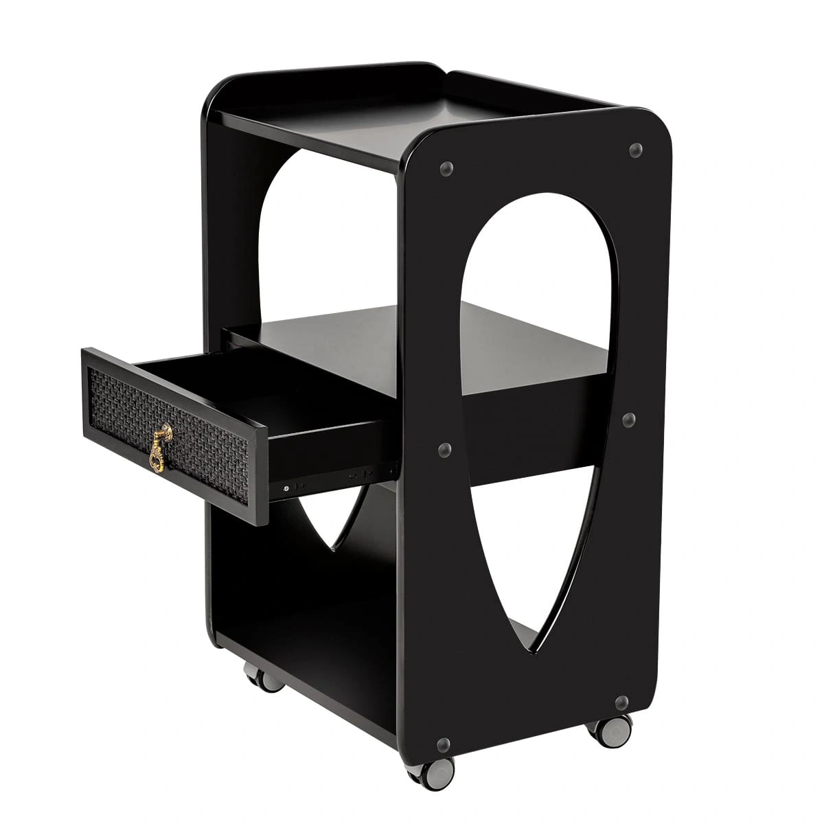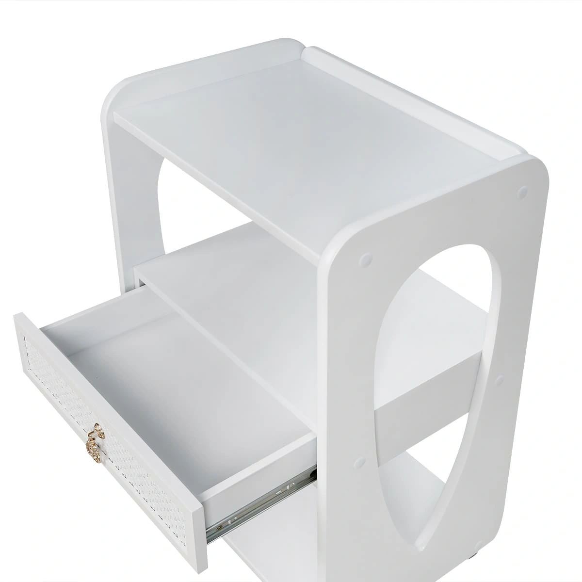 Комплектация: 1 выдвижной ящик с декорированной накладкой и 3 открытые полки; верхняя полка с бортиками; материал – дерево; 2 цвета; 4 опорных колеса, двойные, съемные.