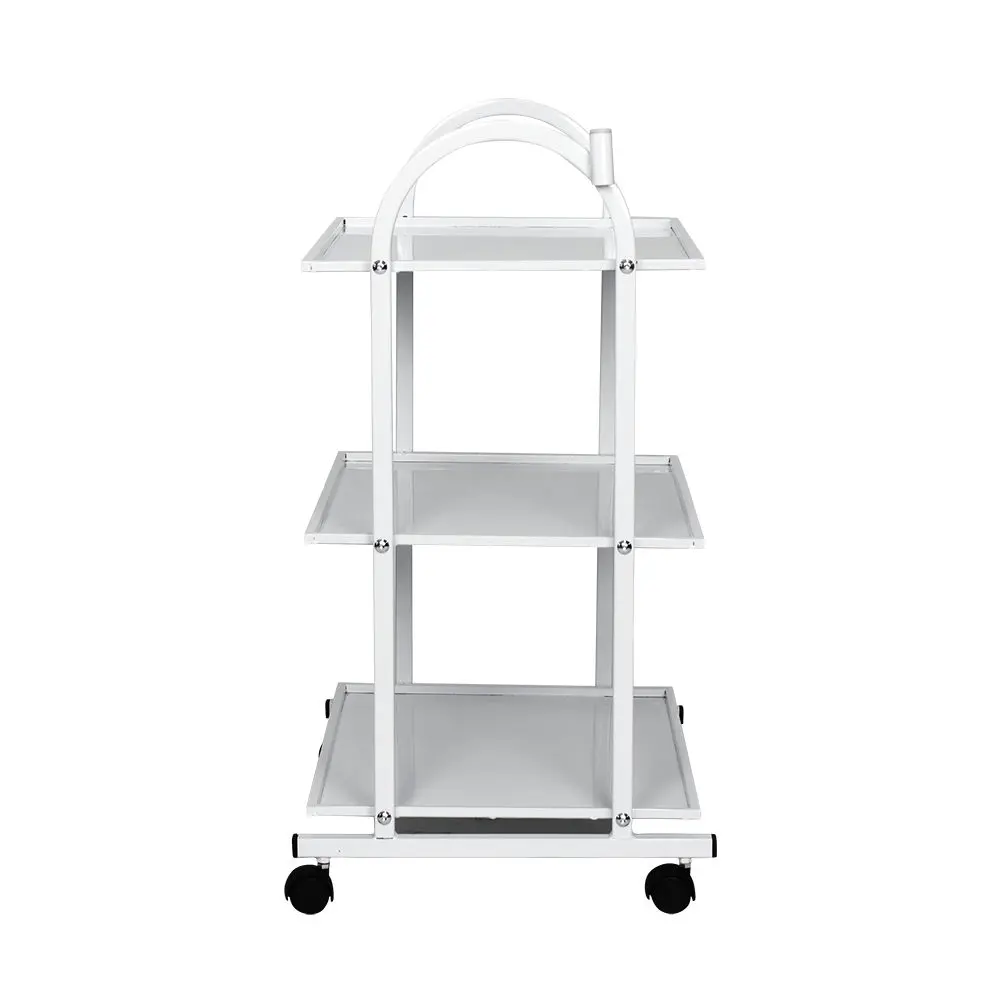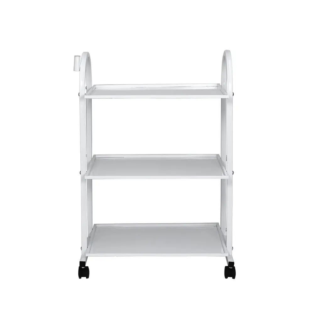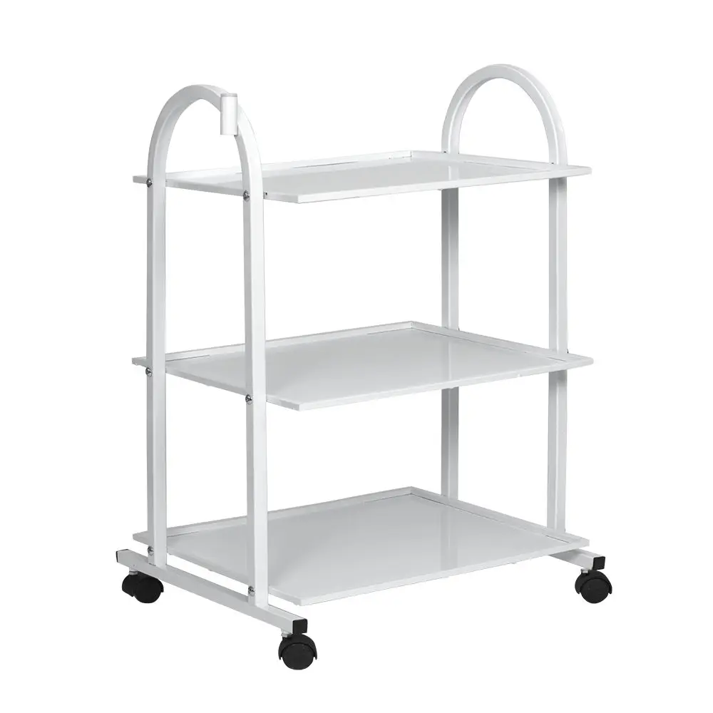 Тележка косметологическая СП на колесах, с тремя удобными полками для размещения рабочих инструментов, оборудования и различных аксессуаров. Каркас тележки металлический, установлен на маневренные колеса из черного пластика. Полки также выполнены из металла и для дополнительного удобства оснащены низкими бортиками со всех сторон. Все металлические элементы окрашены влагоустойчивой порошковой краской в белый цвет, благодаря чему тележка легко очищается с помощью моющих и дезинфицирующих средств. На стойке каркаса расположен специальный держатель для крепления лампы-лупы.