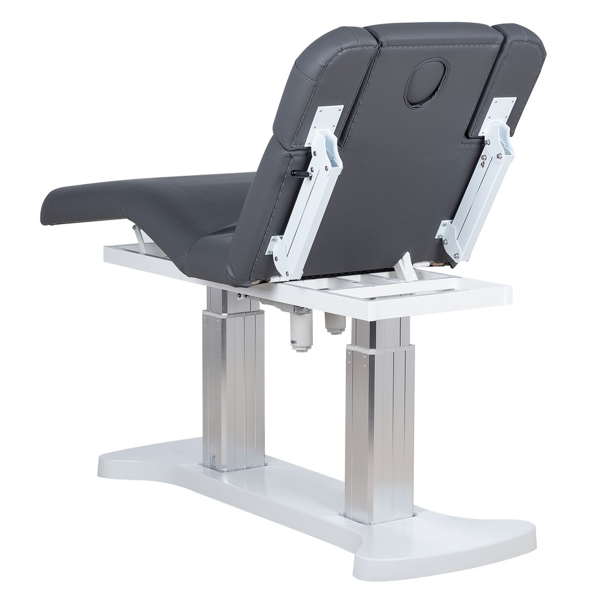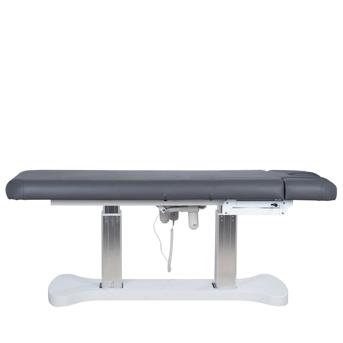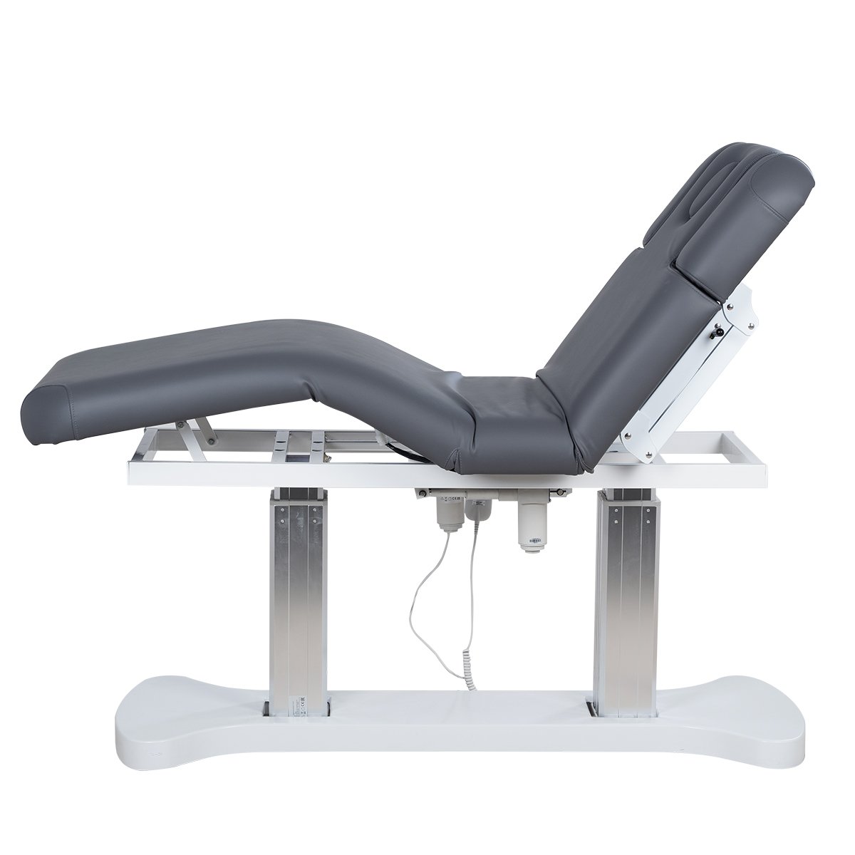 Основание кушетки с углублениями для комфортного подъезда, каркас удлиненный металлический, оснащён двумя минималистичными хромированными колоннами - для равномерного распределения нагрузки на кушетку, в колоннах спрятаны все технические детали и 3 мощных электромотора, при помощи которых осуществляется регулировка высоты и положений кресла.