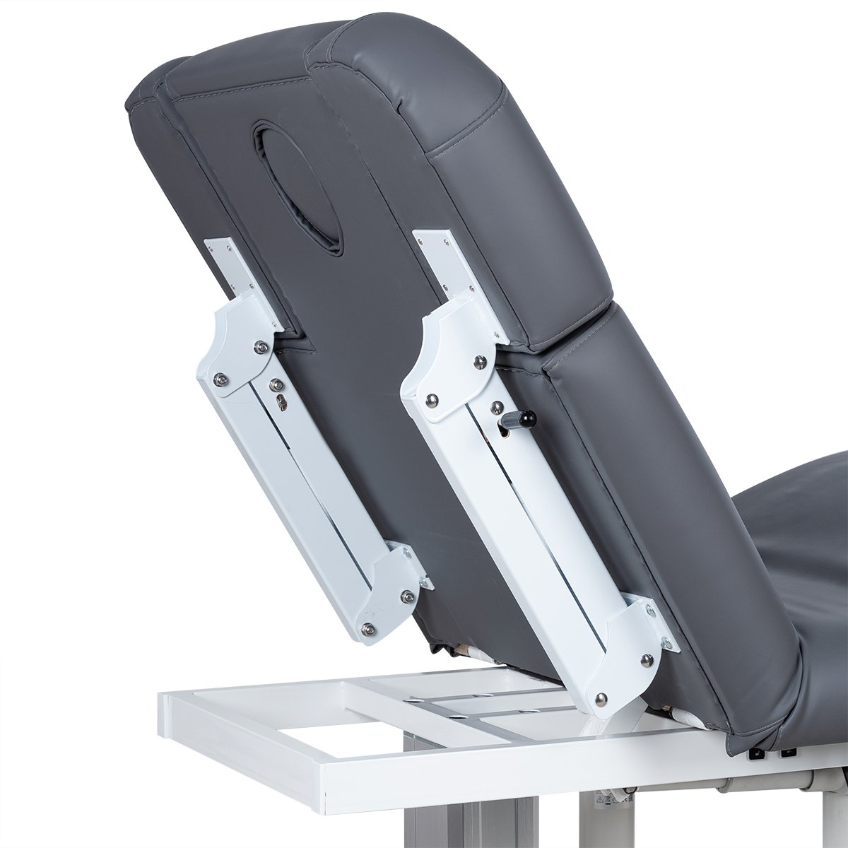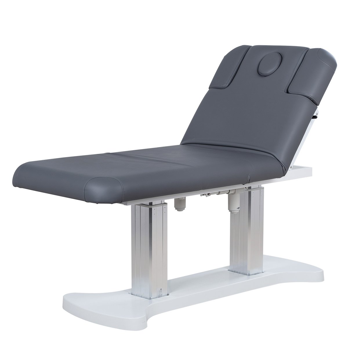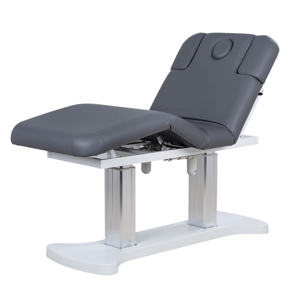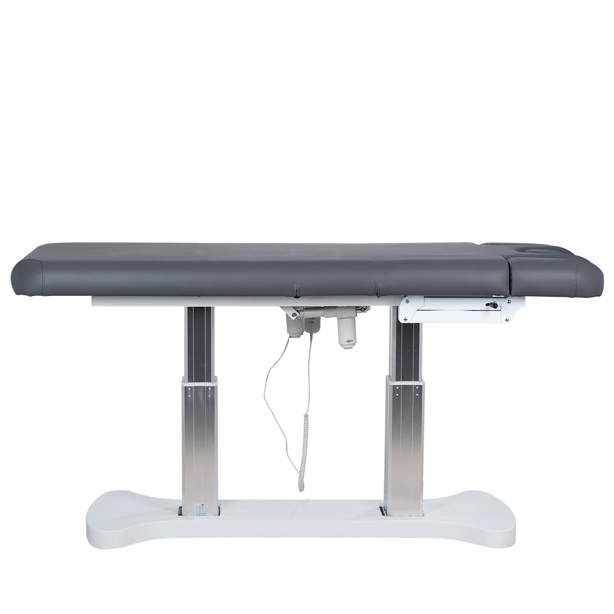 Основание кушетки с углублениями для комфортного подъезда, каркас удлиненный металлический, оснащён двумя минималистичными хромированными колоннами - для равномерного распределения нагрузки на кушетку, в колоннах спрятаны все технические детали и 3 мощных электромотора, при помощи которых осуществляется регулировка высоты и положений кресла.
