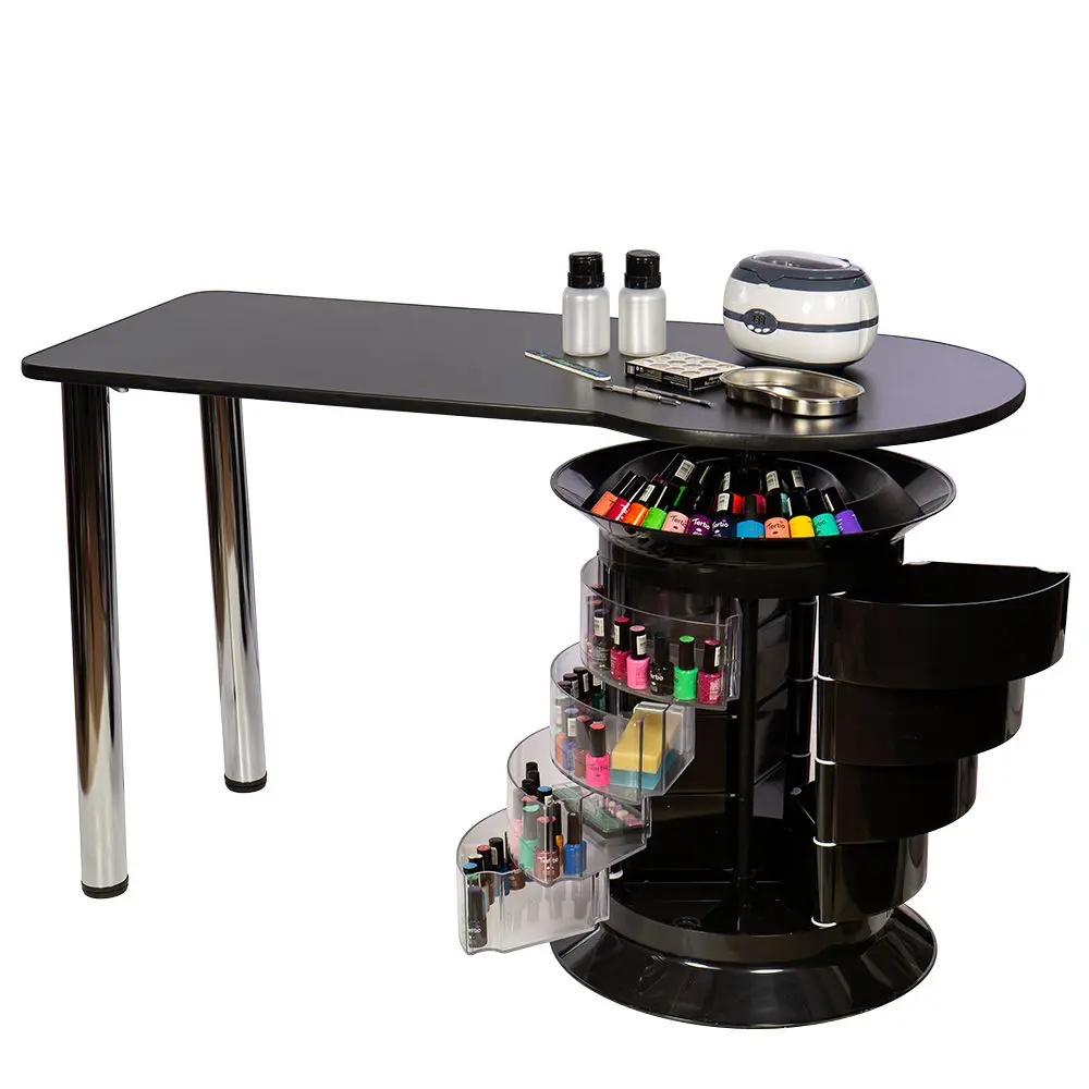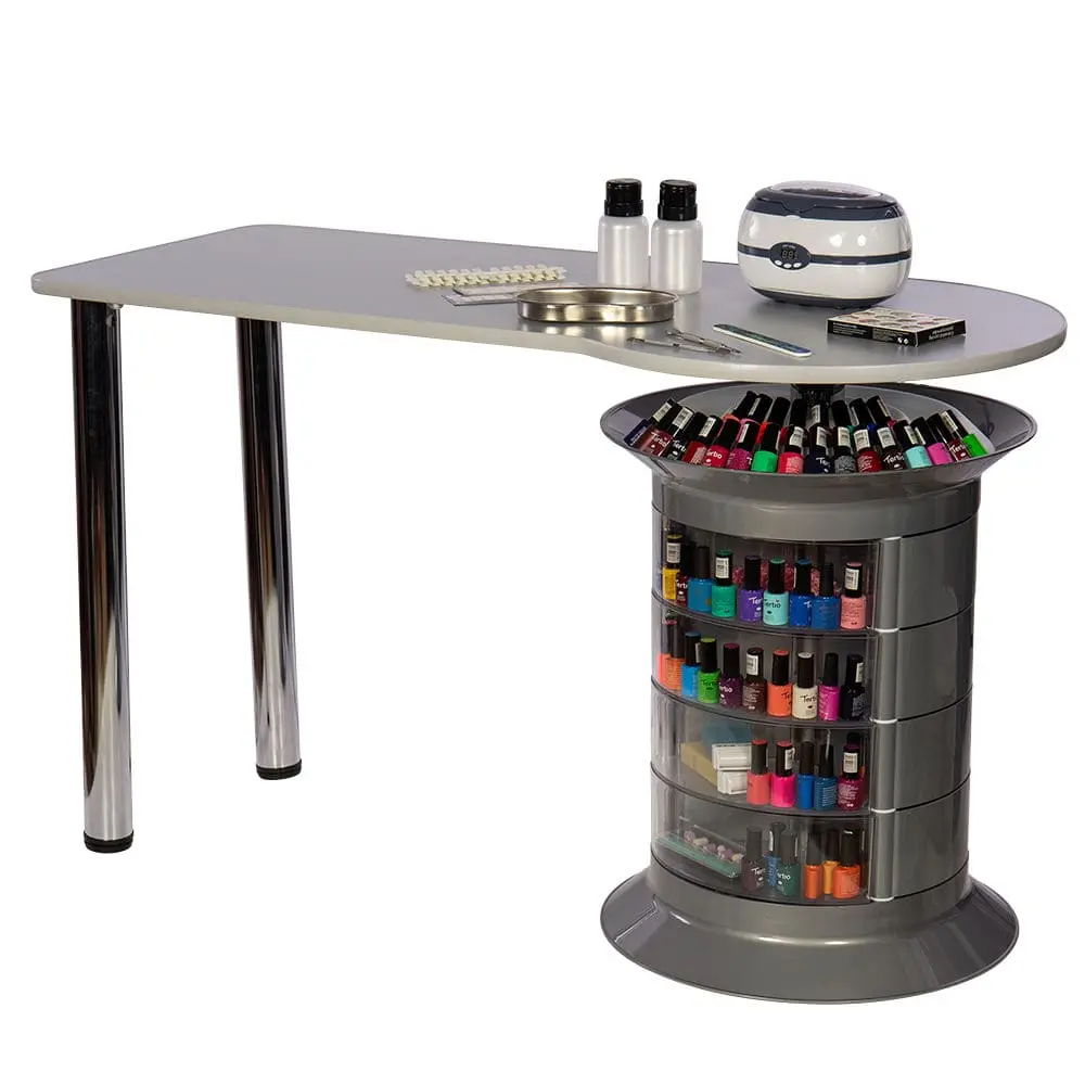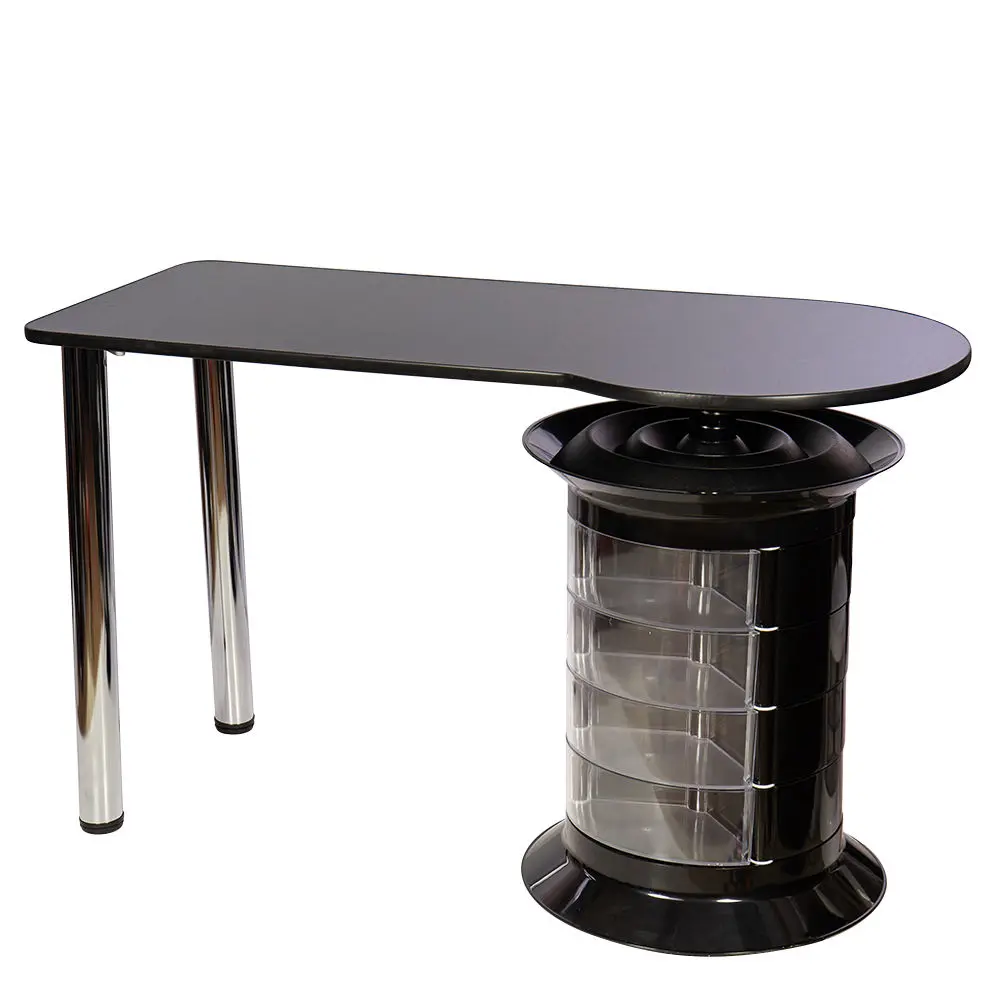 Тумба состоит из 12 выдвижных ящиков, где поместятся приспособления и расходные материалы мастера. Четыре прозрачных ящика можно использовать для инструментов, часто используемых в работе. Функция вращения тумбы поможет быстро найти необходимые принадлежности. Над тумбой есть практичная полочка, разработанная для хранения лаков. Ширина столешницы позволит установить сопутствующее оборудование.