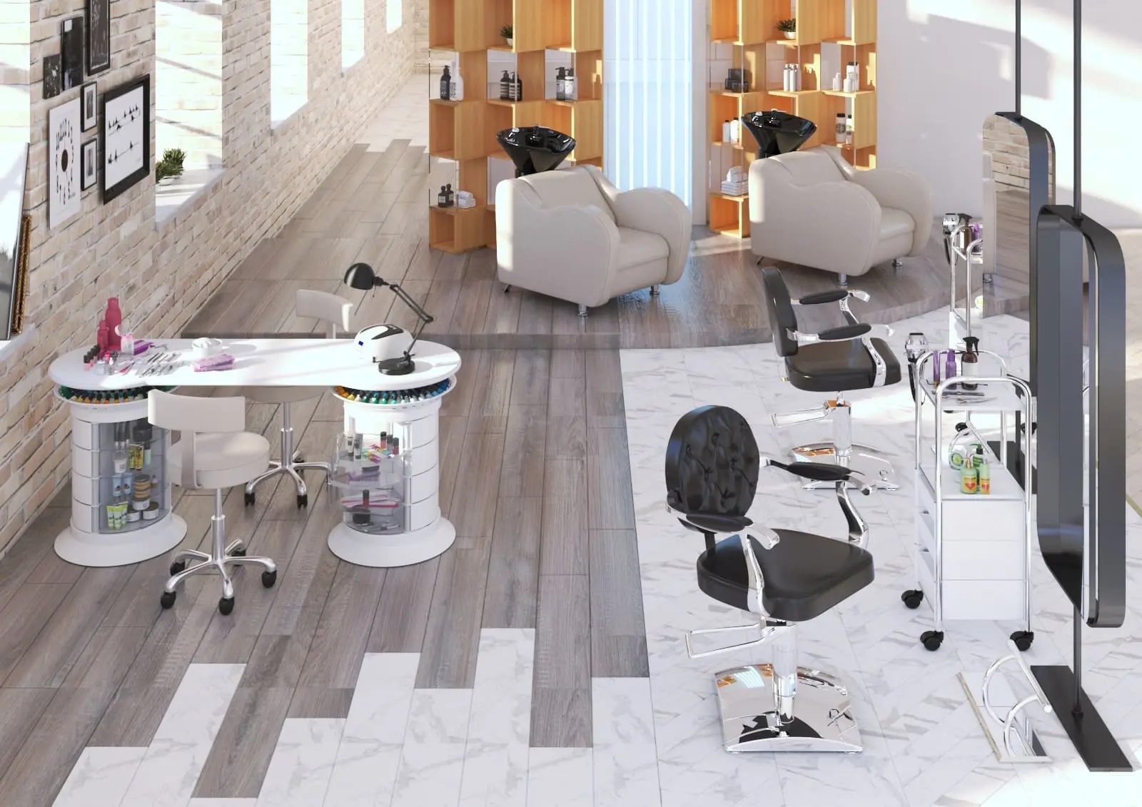 В тумбах 24 ящика, в которых мастер сможет хранить абсолютно все инструменты и расходные материалы. В каждой тумбе есть четыре прозрачных ящичка. Так мастер сможет найти необходимые принадлежности еще быстрей. Крышки над тумбочками разработаны специально для хранения лаков.