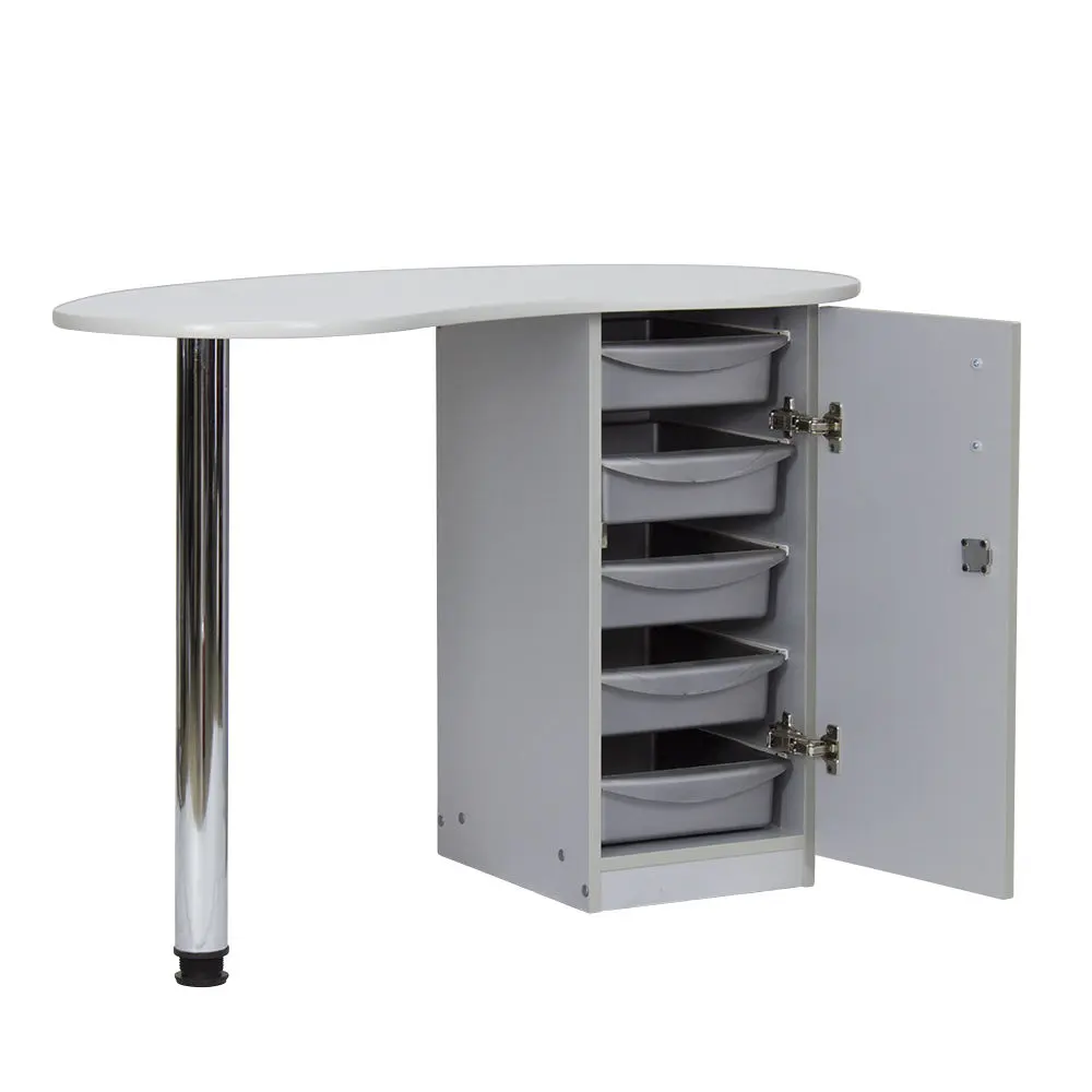 Столешница имеет форму капли. На широкой стороне столешницы мастер может поставить аппараты для маникюра, стойку с лаками, лампу и прочие аксессуары. Узкая сторона открывает легкий доступ к рукам клиента. С вместительными ящиками каждый предмет для маникюра будет лежать на своем месте. Переместить стол не потребует особых усилий, ведь под тумбой есть встроенные маневренные колеса.