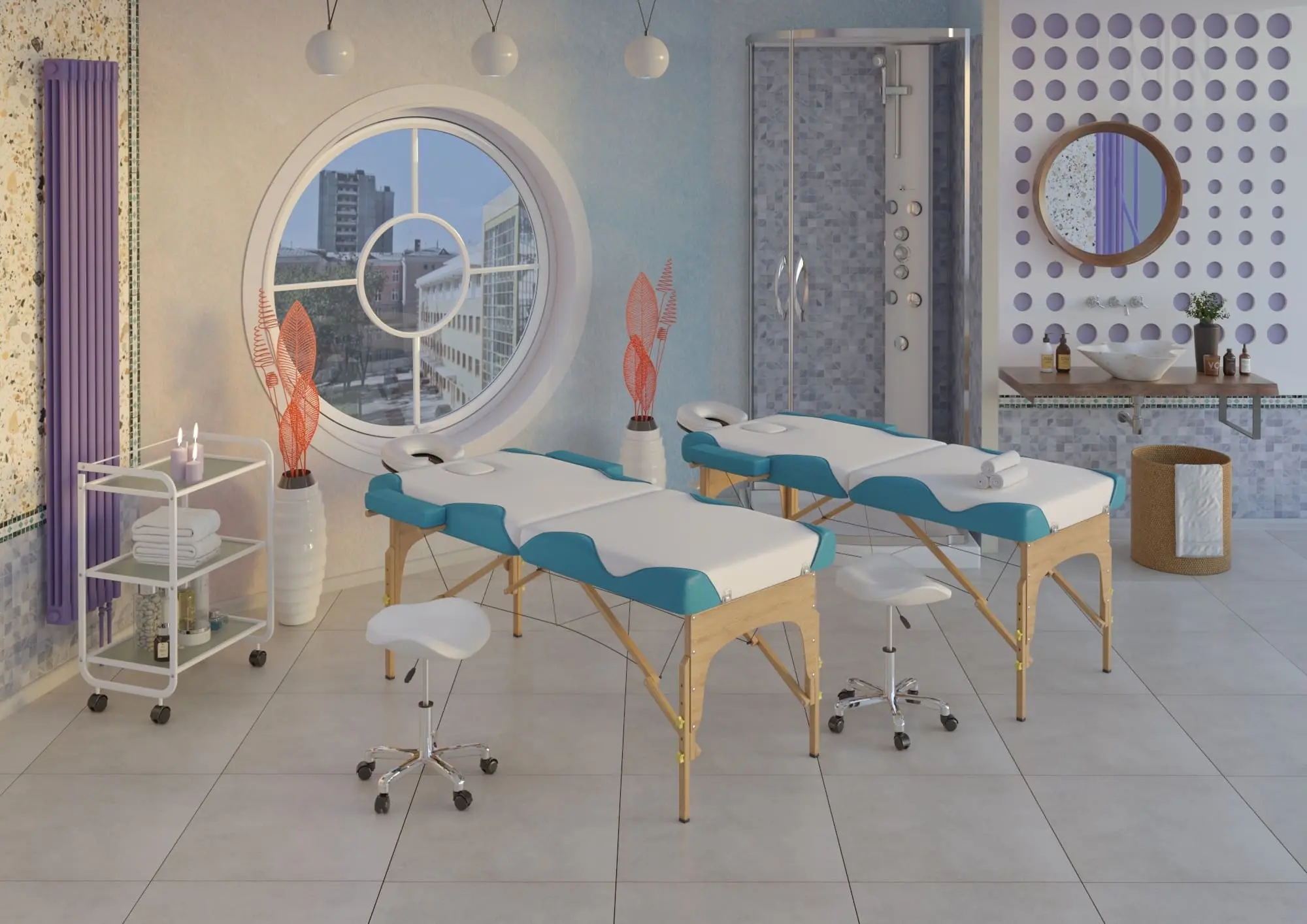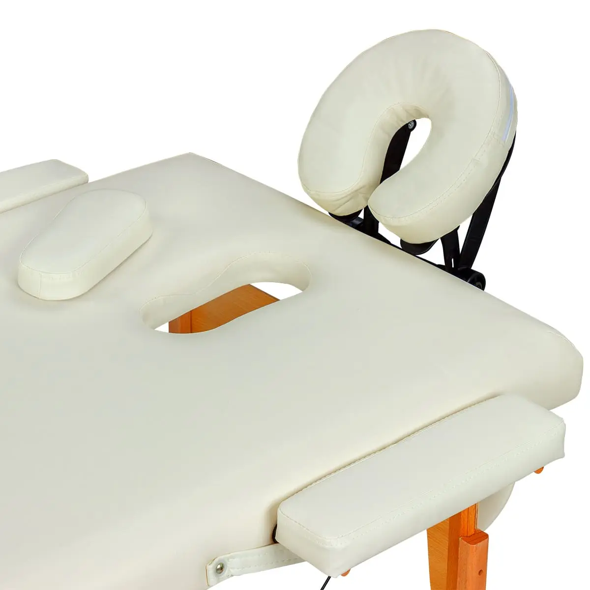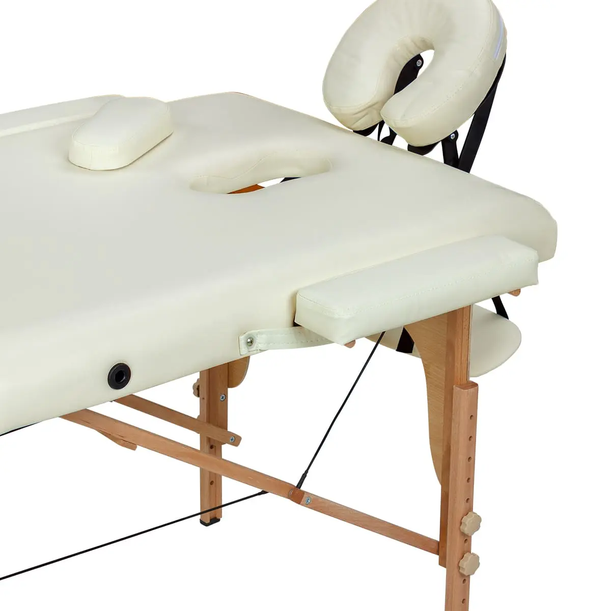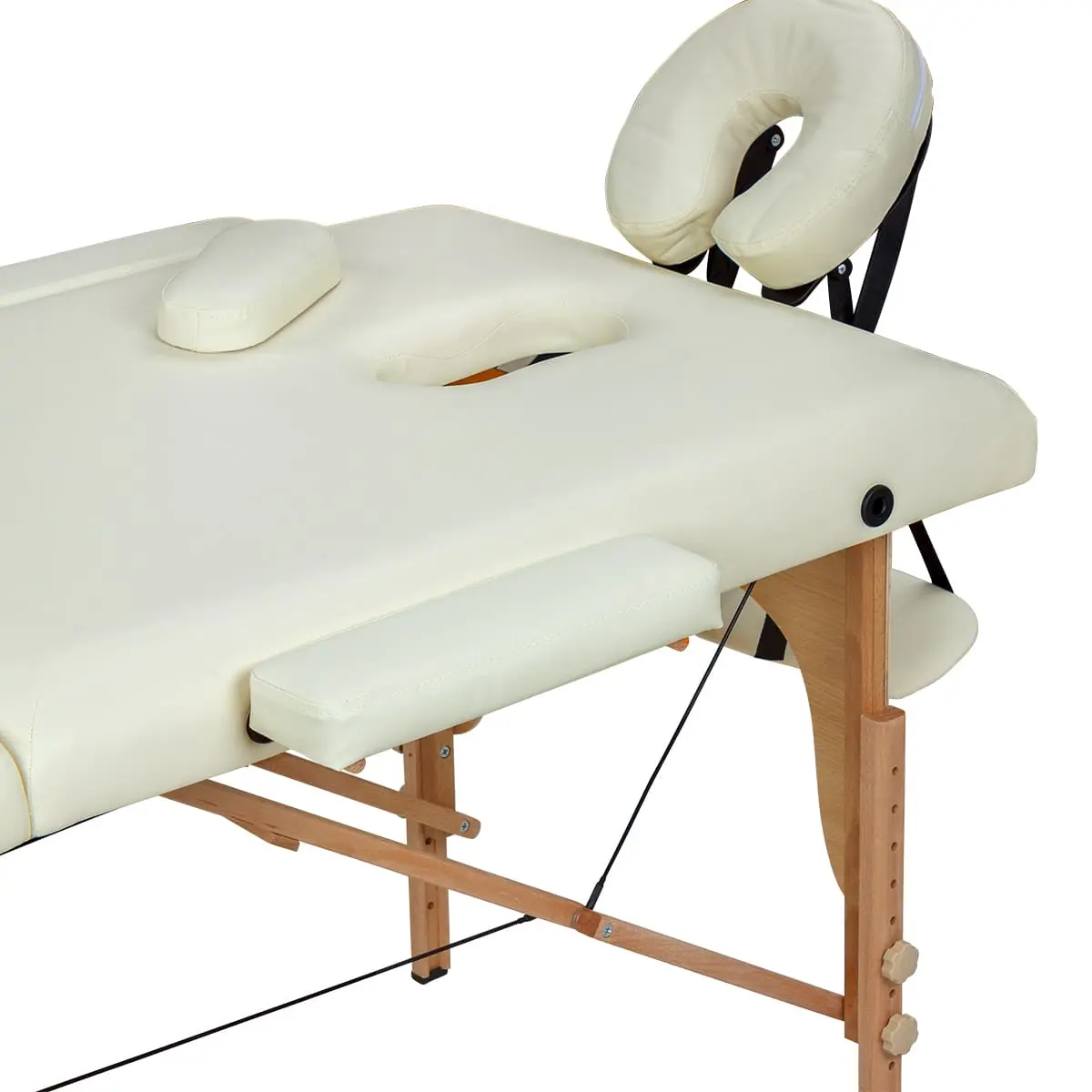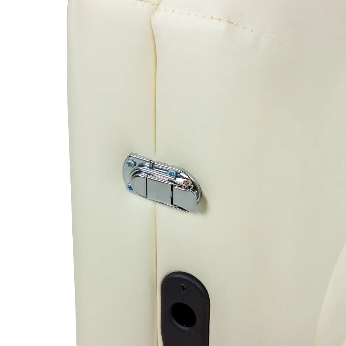 Продуманная конструкция массажной кушетки обеспечит максимальный комфорт клиенту во время массажа спины, шеи и ног. В спинке есть удобное отверстие для лица. Для удобства рук предусмотрены мягкие подлокотники.