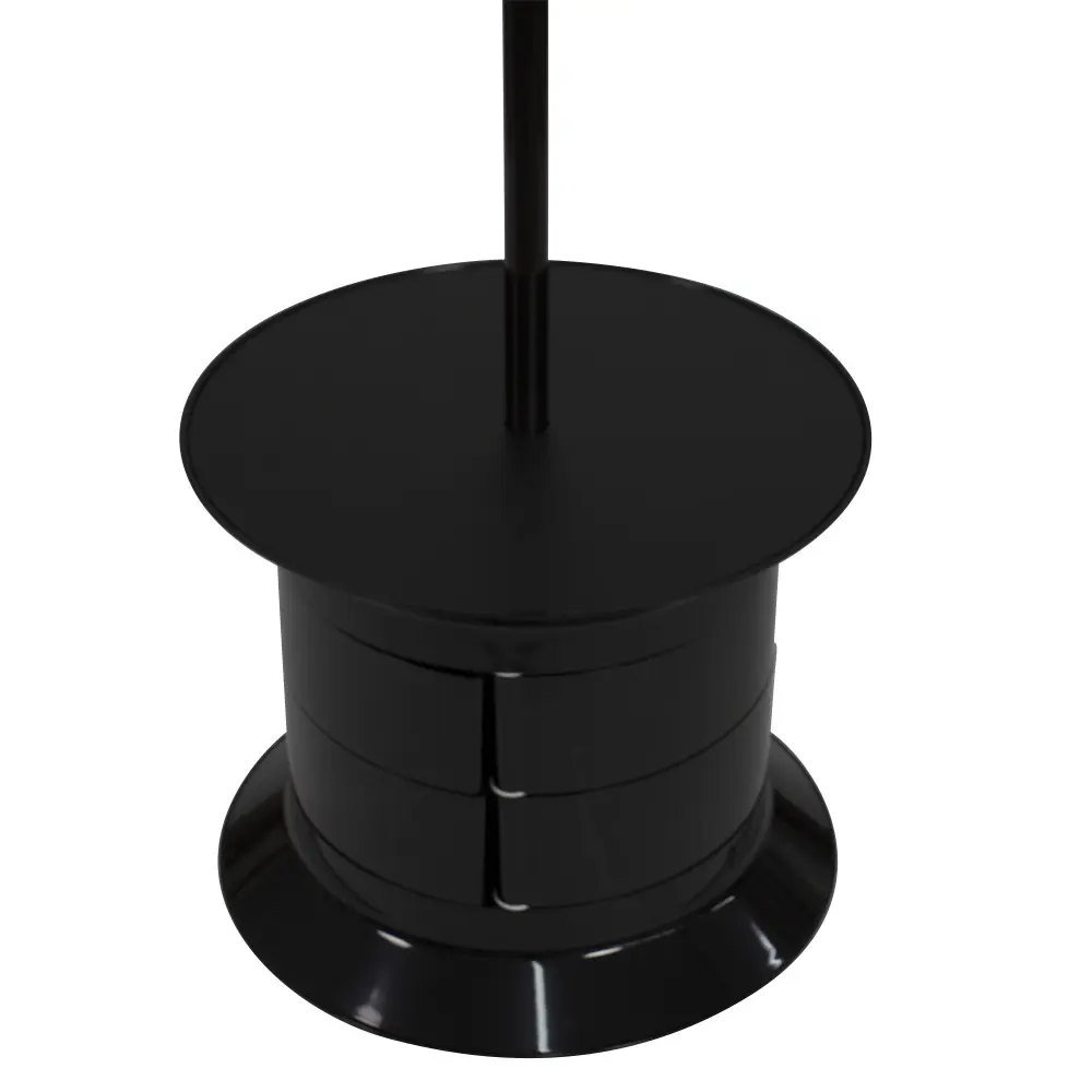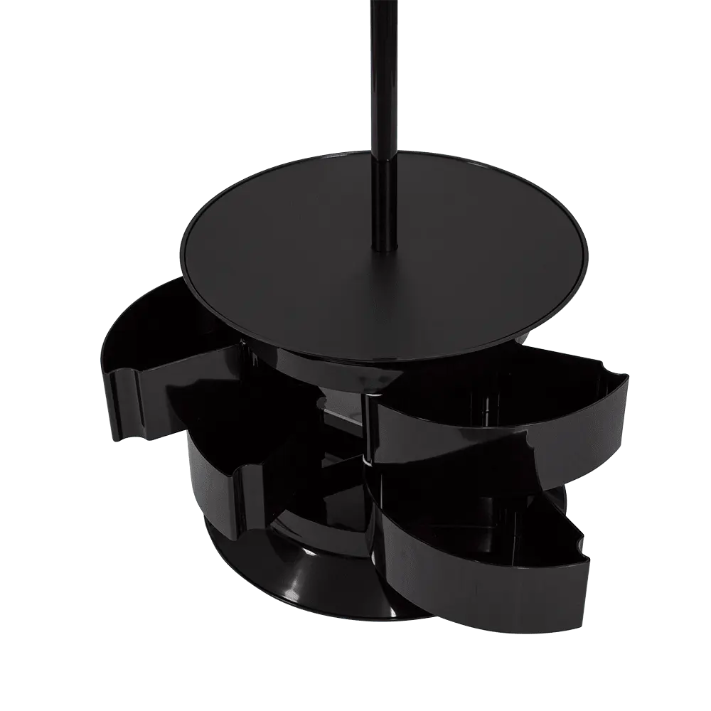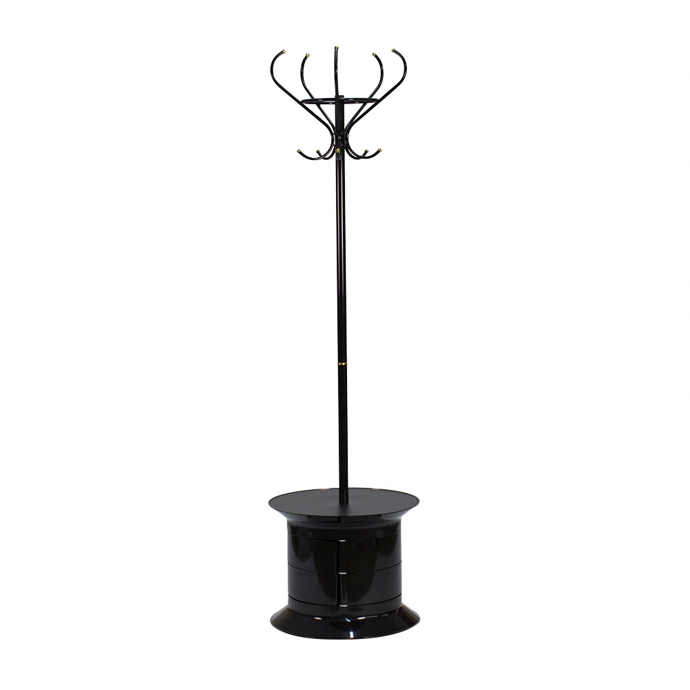 Модель укомплектована тумбой с шестью вместительными ящиками. Для обеспечения мобильности вешалка оснащена вращающимися колесами.