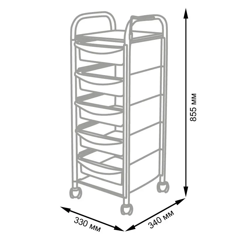 Комплектация: основа из металла на манёвренных колесиках, боковые пластиковые панели, выдвижные ящики (5 штук), верхняя полка.