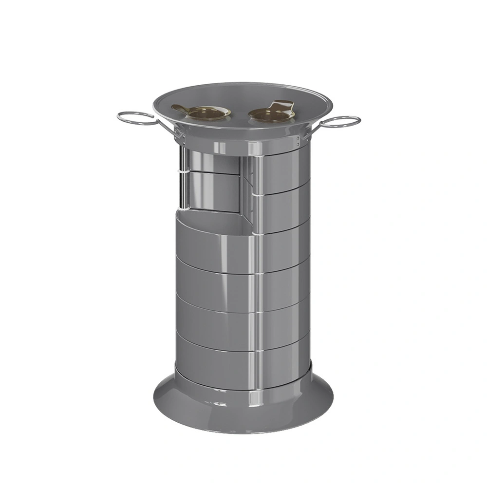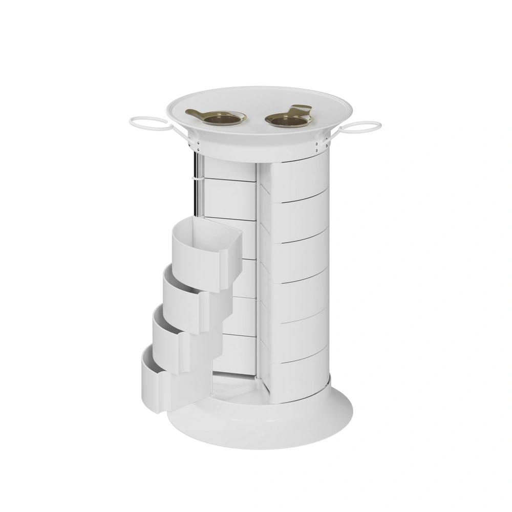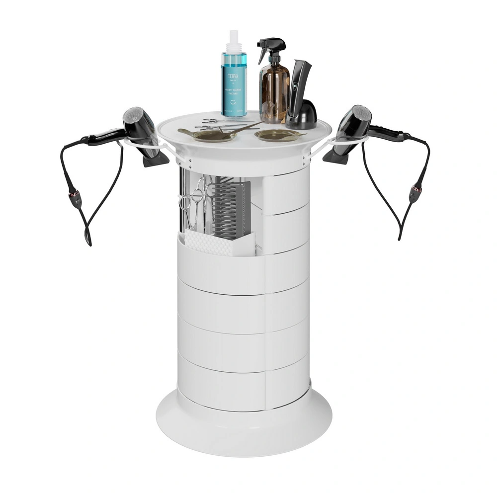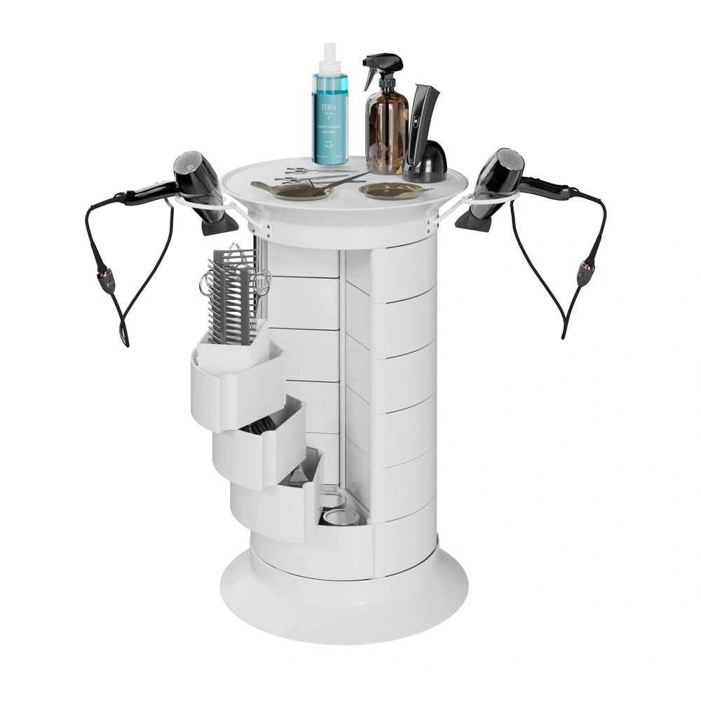 Продуманная конструкция позволит мастеру хранить все свои приспособления в одном месте. В распоряжении специалиста 16 раздвижных ящичков, которые поворачиваются вокруг стоек каркаса. Чтобы в тумбе можно было поставить высокие сосуды, с одной стороны отсутствует два ящика. Верхняя полка имеет специальные отверстия, предназначенные для емкостей и чаш. С двух сторон крышка оборудована держателями для фенов. Мобильность мебели обеспечивается шестью поворотными колесиками. Тележка может быть использована для обстановки двух рабочих мест.