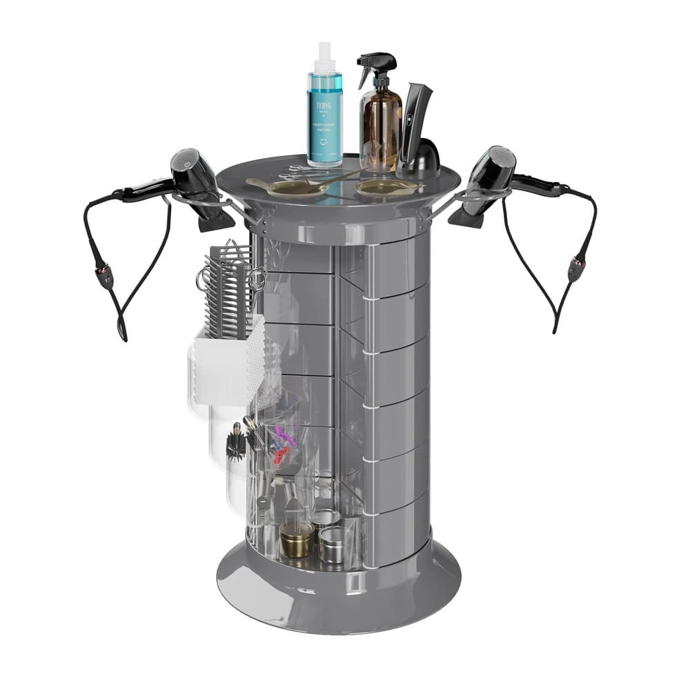 Продуманная конструкция позволит мастеру хранить все свои приспособления в одном месте. В распоряжении специалиста 16 раздвижных ящичков, которые поворачиваются вокруг стоек каркаса. Чтобы в тумбе можно было поставить высокие сосуды, с одной стороны отсутствует два ящика. Верхняя полка имеет специальные отверстия, предназначенные для емкостей и чаш. С двух сторон крышка оборудована держателями для фенов. Мобильность мебели обеспечивается шестью поворотными колесиками. Тележка может быть использована для обстановки двух рабочих мест.