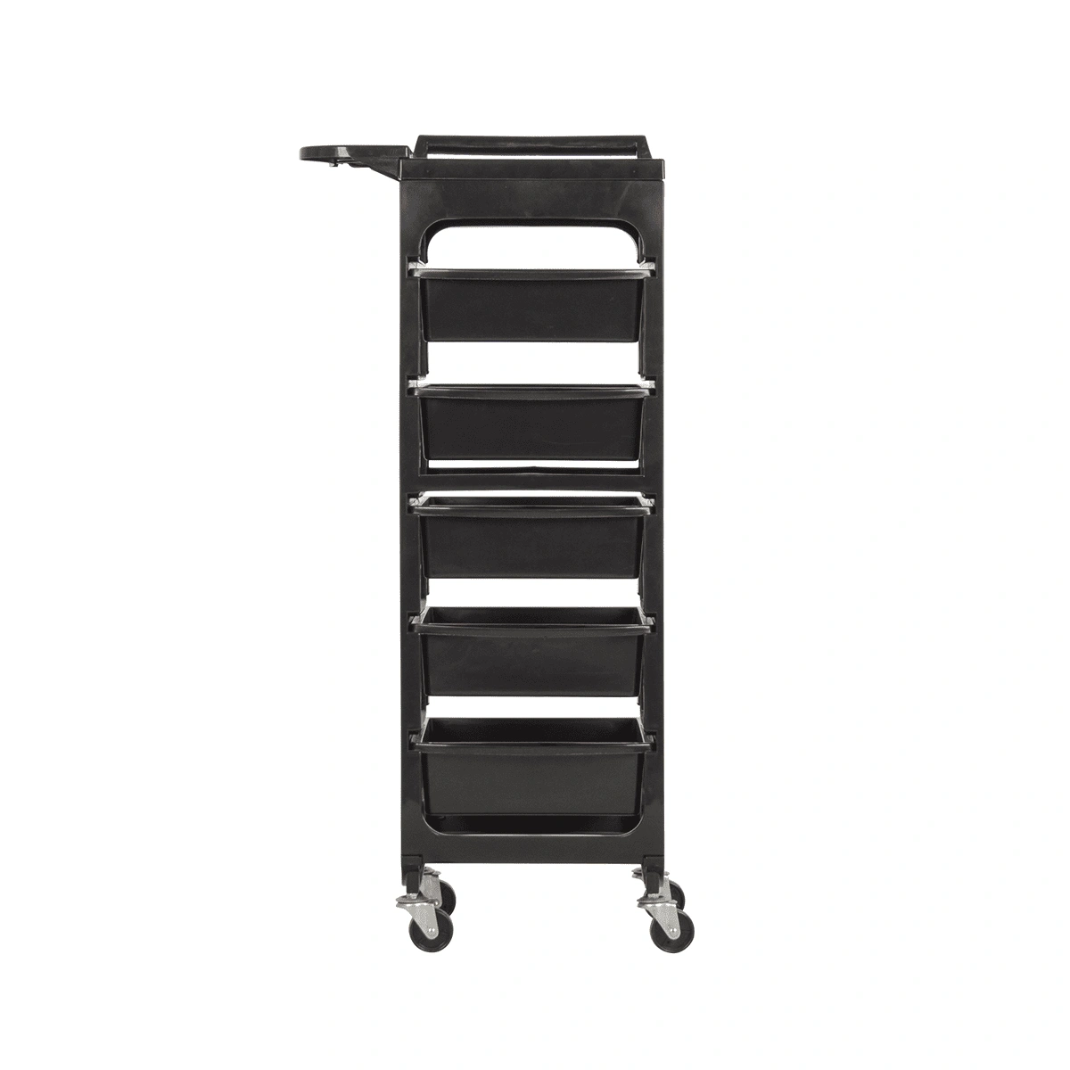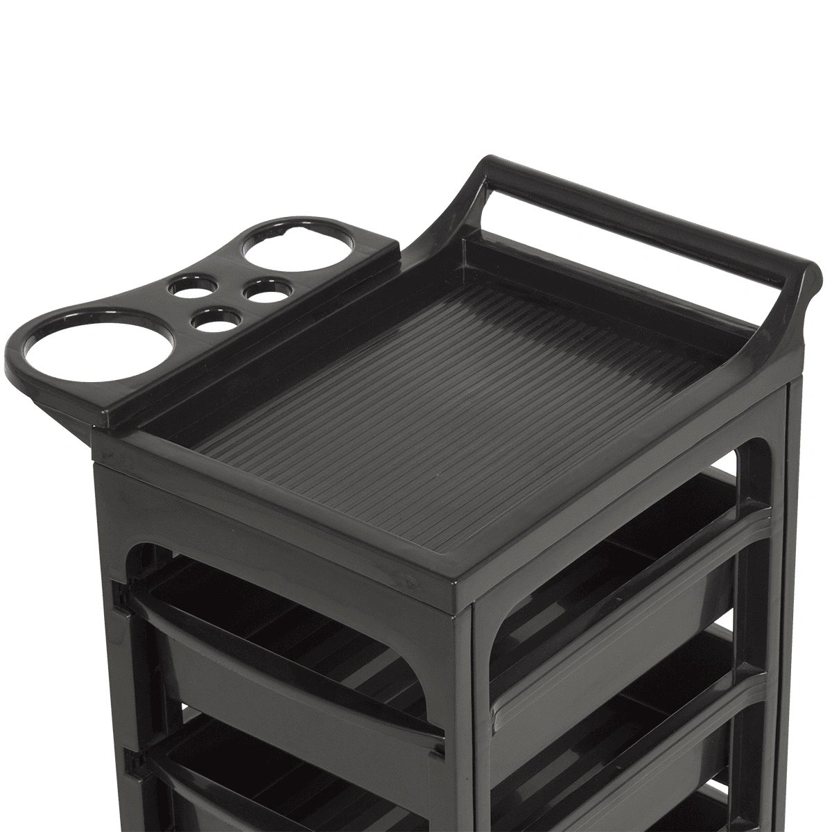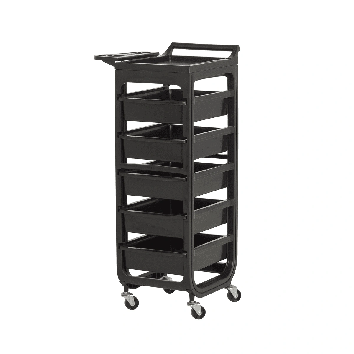 Комплектация: каркас на маневренных колесиках, пять ящиков, верхняя крышка с ручкой для перемещения парикмахерской тележки, боковая полочка с отверстиями для фена, чаши и брашингов. Предусмотрен держатель для фена с отверстиями разного диаметра.