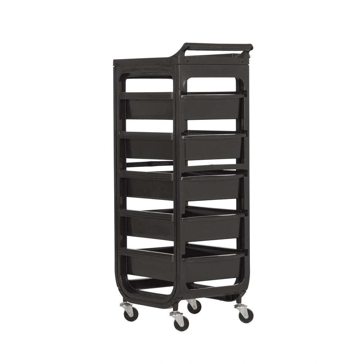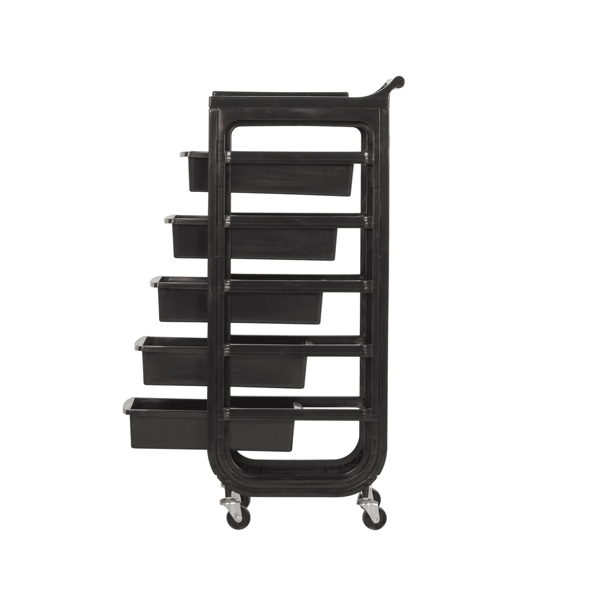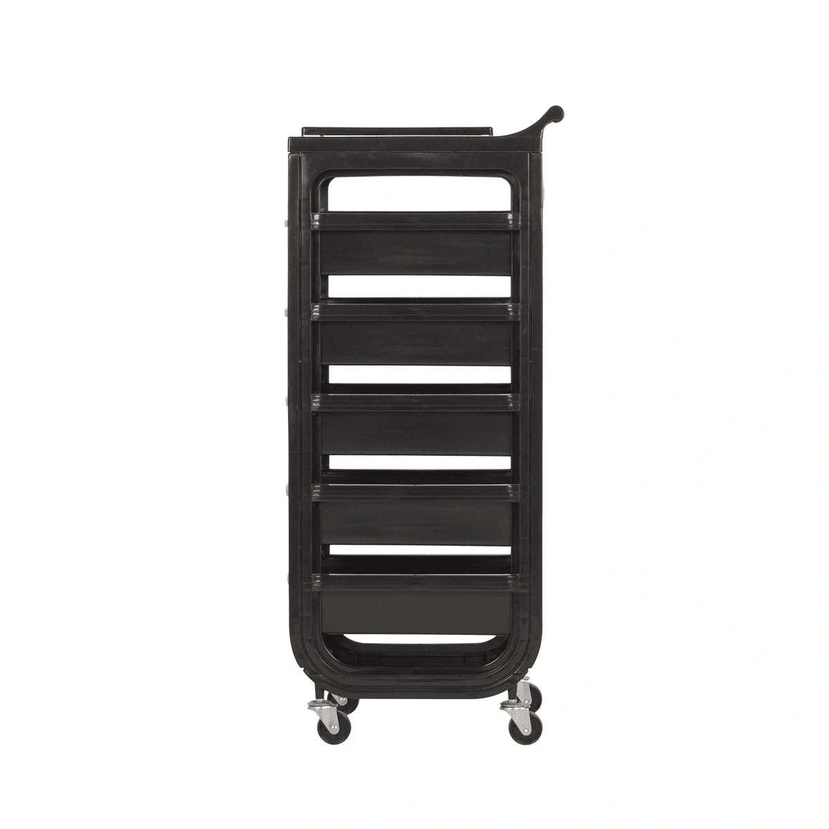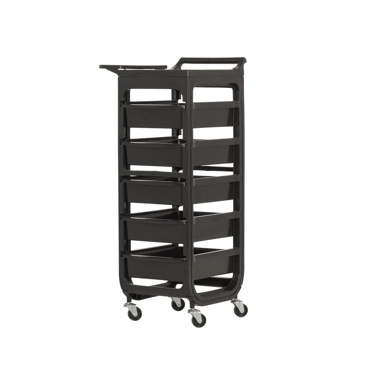 Комплектация: каркас на маневренных колесиках, пять ящиков, верхняя крышка с ручкой для перемещения парикмахерской тележки, боковая полочка с отверстиями для фена, чаши и брашингов. Предусмотрен держатель для фена с отверстиями разного диаметра.
