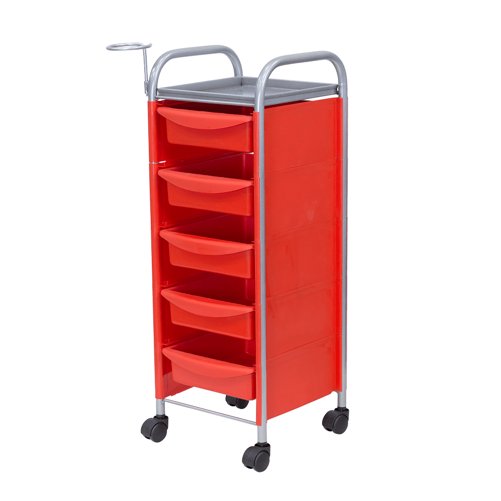 Купить тележку парикмахерскую М-02 можно с пятью вместительными выдвижными ящиками из ударопрочного пластика. Также для инструментов и прочих рабочих принадлежностей предусмотрена функциональная полочка. Для дополнительного удобства во время работы к каркасу прикреплен съемный фенодержатель. В нашем магазине парикмахерская тележка М-02 представлена в черном, сером, красном и белом цвете.
