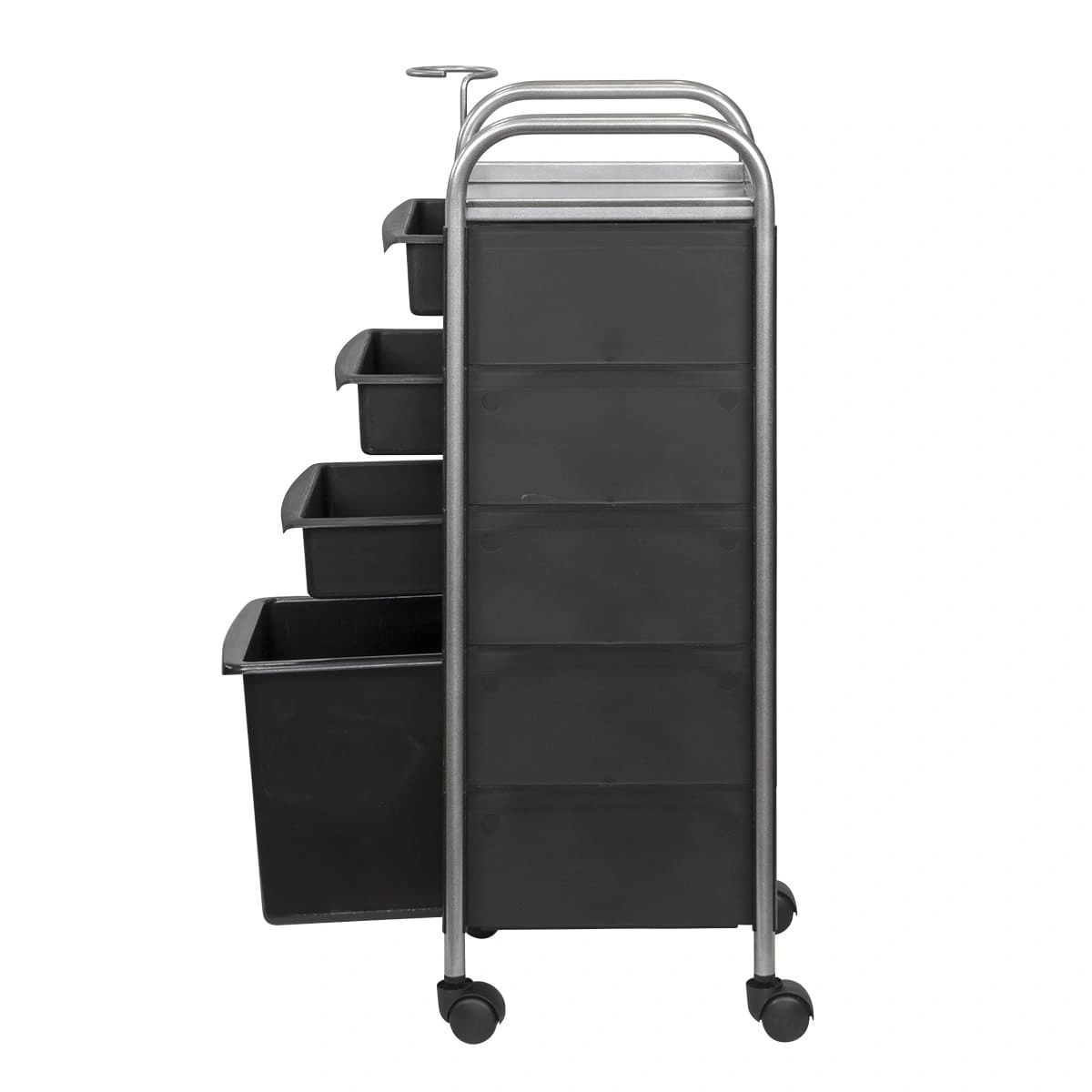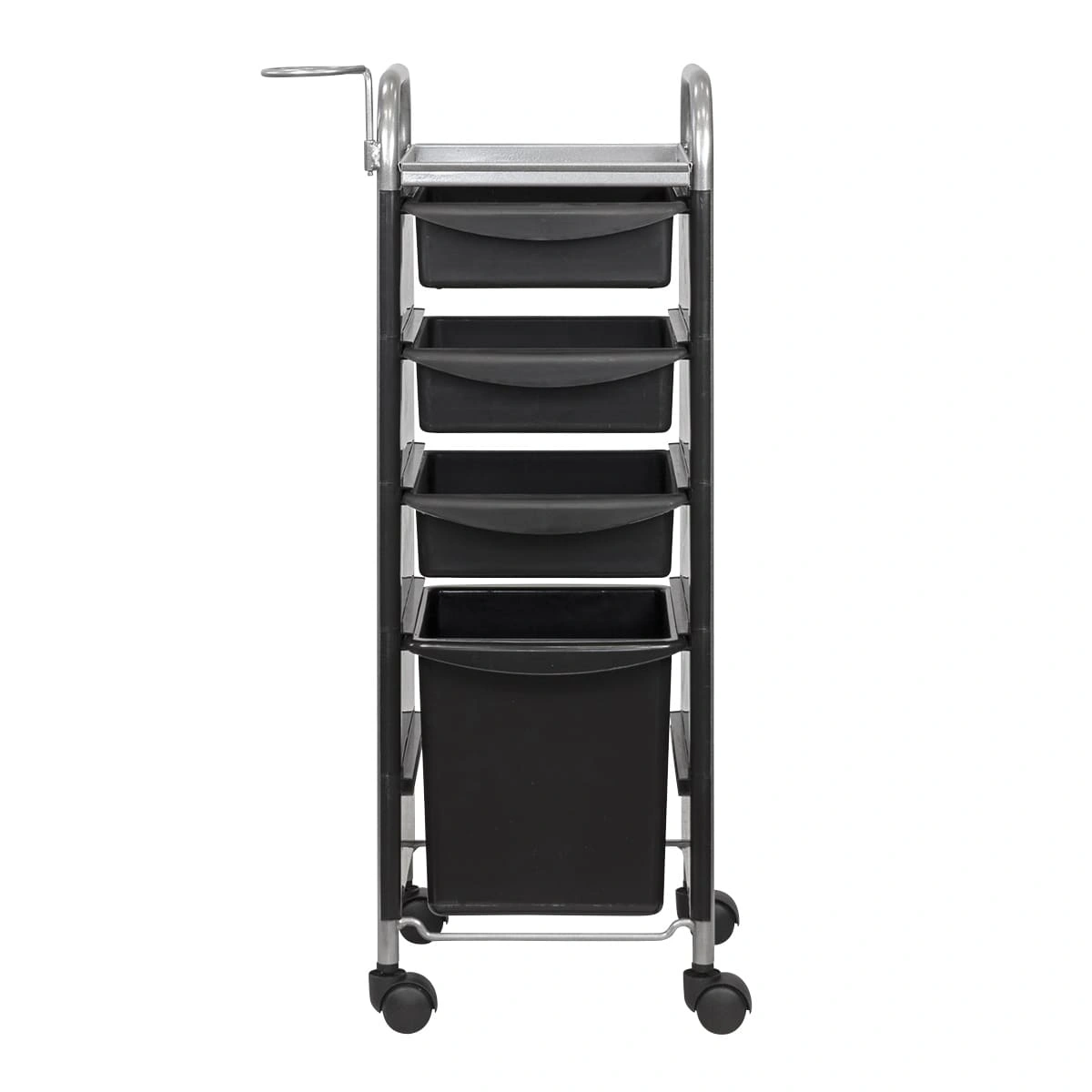 Комплектация: каркас из металла на пластиковых колесах, боковые пластиковые панели, выдвижные ящики, верхняя полка, металлический держатель для фена.