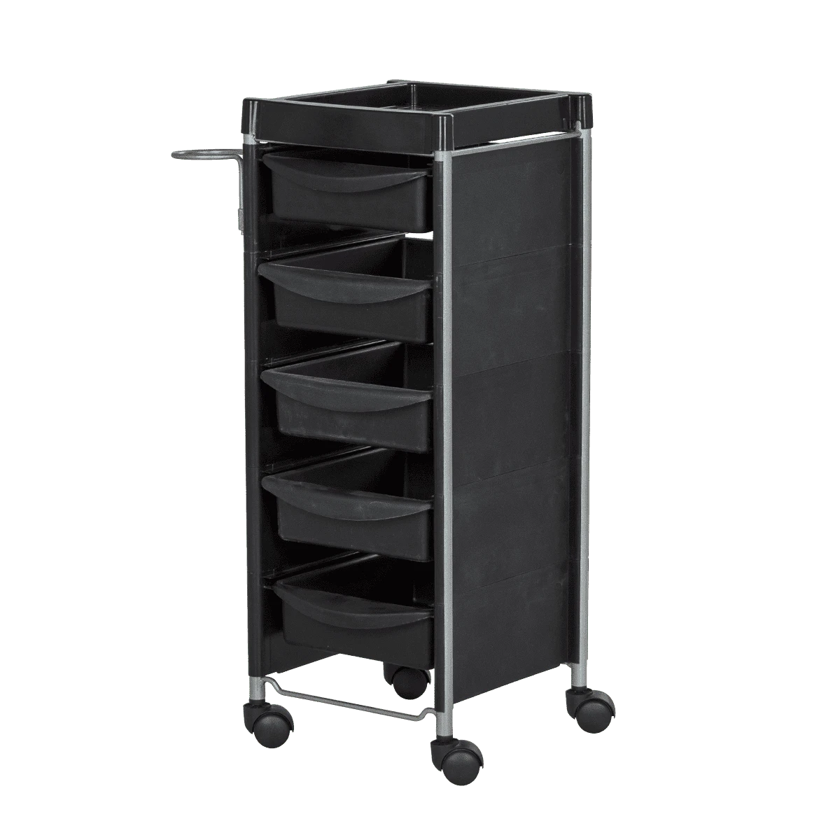 В каталоге нашего магазина Вы можете подобрать и купить парикмахерскую тележку М-04 в черном или другом цвете на выбор. Модели одной серии отличаются только цветом выдвижных ящиков: черный, фиолетовый, зеленый, оранжевый, красный, белый и серебристый.