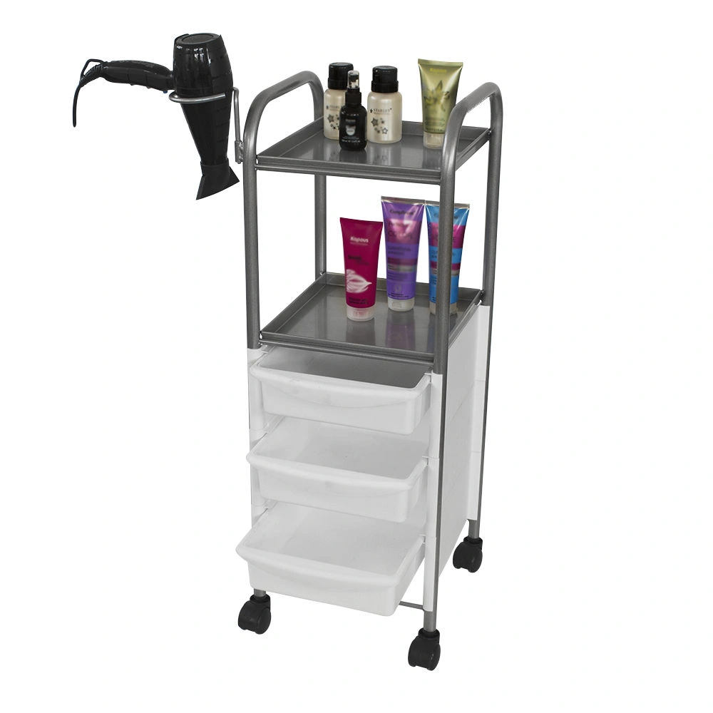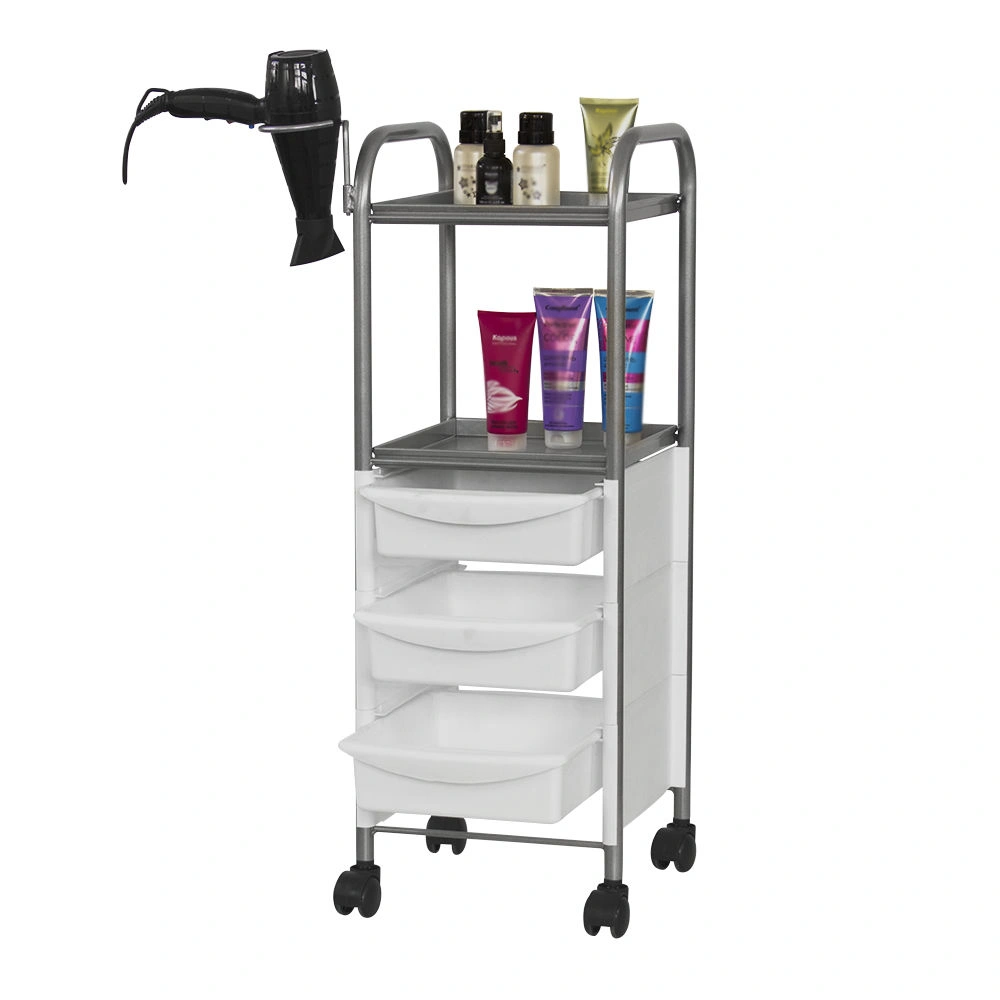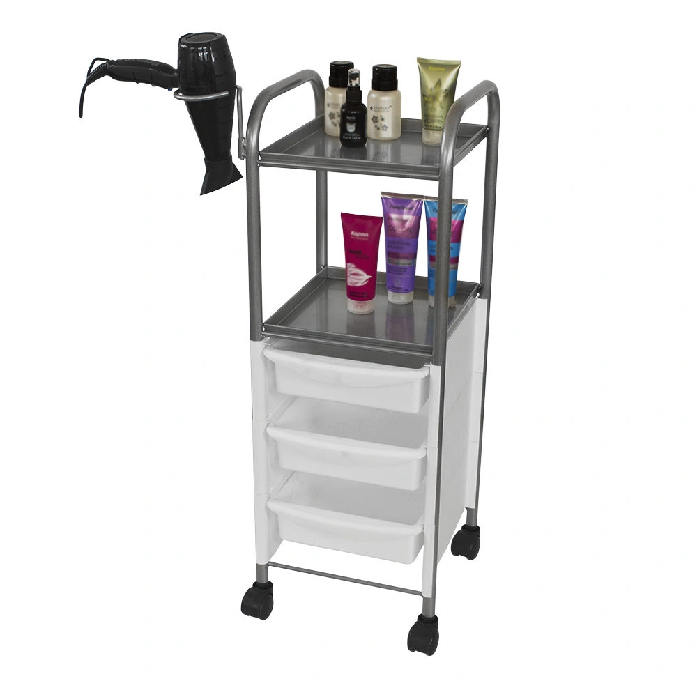 Наличие бортиков убережет инструмент от случайного падения. Практичное дополнение парикмахерской тележки – удобный держатель для фена. Оборудование можно переместить в любую точку салона благодаря манёвренным колесикам.