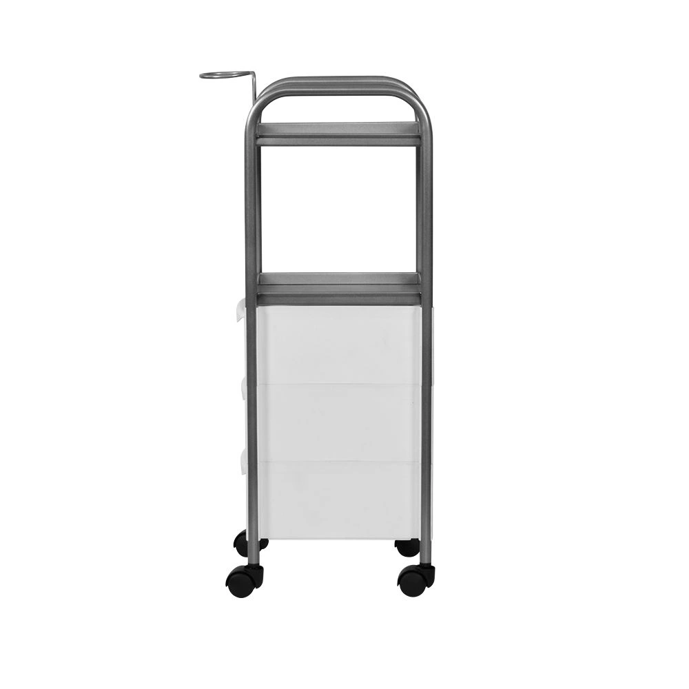 Каркас, полочки и фенодержатель изготовлены из прочного металла. Для защиты от коррозии и влаги на поверхность нанесен слой краски. Для создания боковин и ящиков использован качественный пластик устойчивый к влиянию очищающих средств. Пластиковые колеса предотвратят скольжение конструкции.