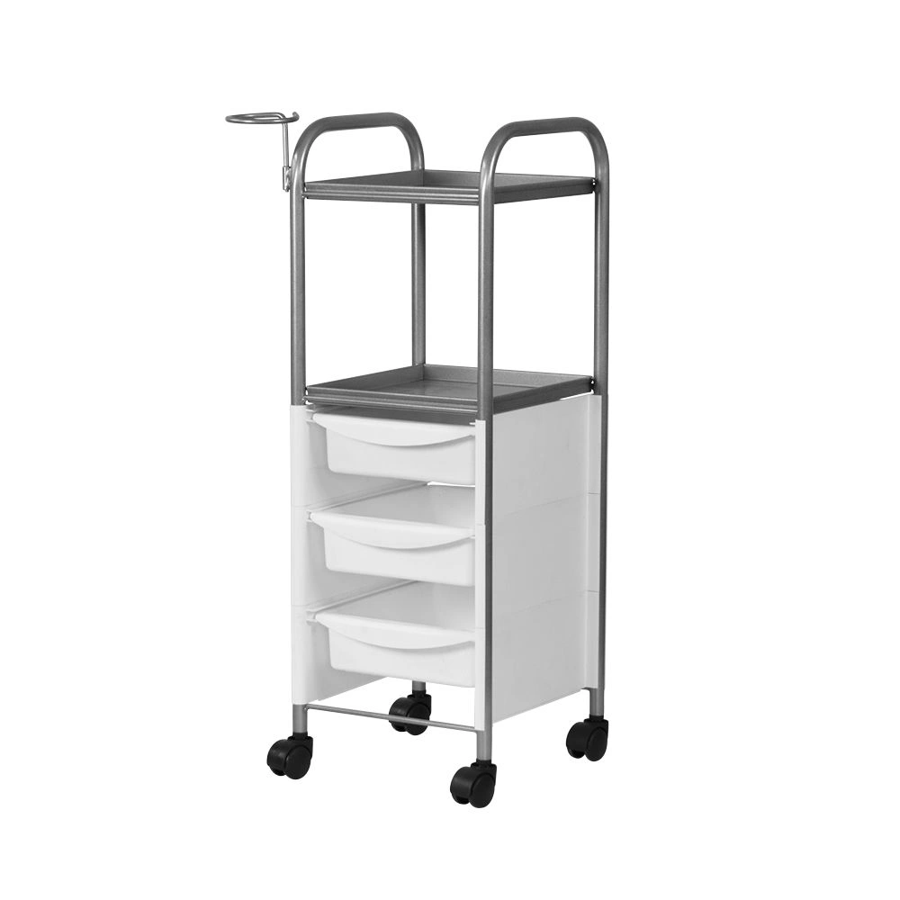 Комплектация: основа на маневренных колесиках, боковые панели, три ящичка, 2 полочки, держатель для фена
