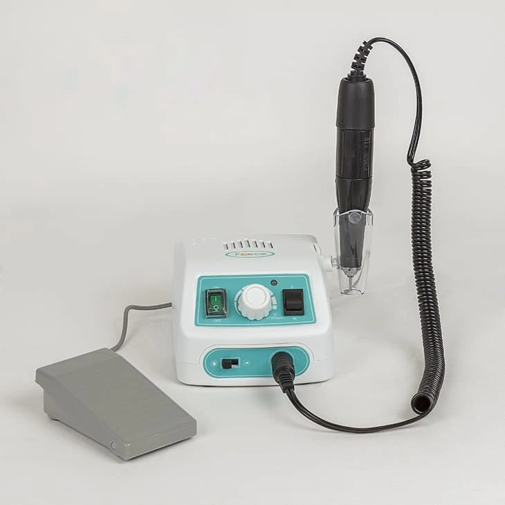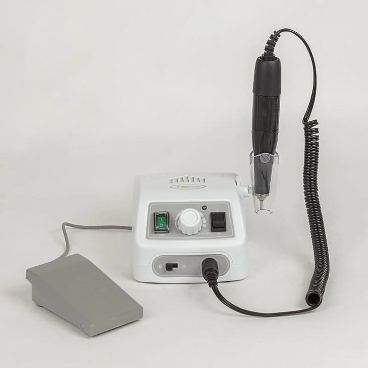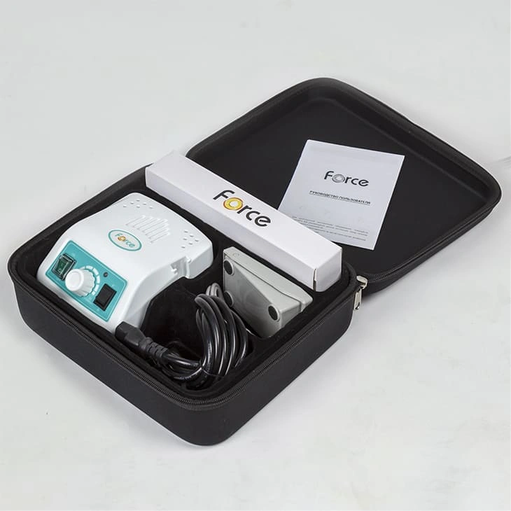 Комплектация: блок питания, держатель для наконечника, рукоять с микродвигателем, электрический шнур, инструкция, сумка, ножная педаль.