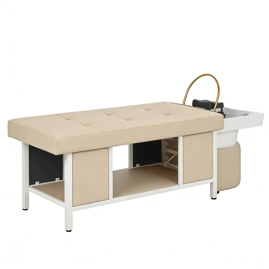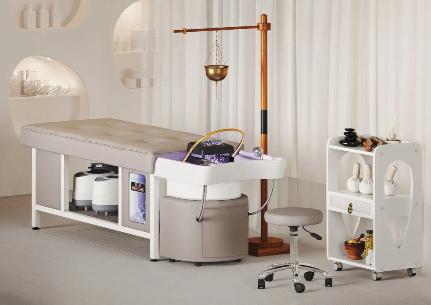 Наоми — спа-кушетка для процедуры head spa, которая превращает обычный уход за волосами в настоящее SPA-путешествие. Продуманная эргономика обеспечивает максимальный комфорт во время процедур, а мягкое ложе поддерживает тело клиента, позволяя полностью расслабиться. Аква-дуга равномерно распределяет потоки воды, создавая эффект глубокого массажа кожи головы и усиливая действие косметических средств.