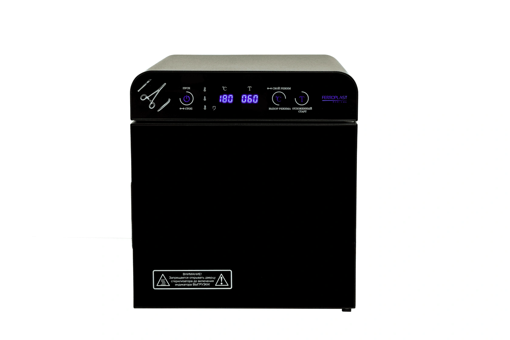Стерилизатор "Ферропласт" при загруженной стерилизационной камере должен обеспечивать автоматическую поддержку температурных режимов в диапазоне от +85°С до +180°С и времени стерилизационной и дезинфекционной выдержки, а также пользовательского программируемого режима +50°С до +200°С, интервалом от 1 до 999 минут.